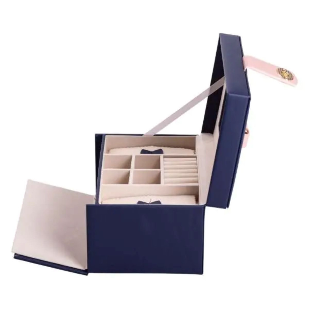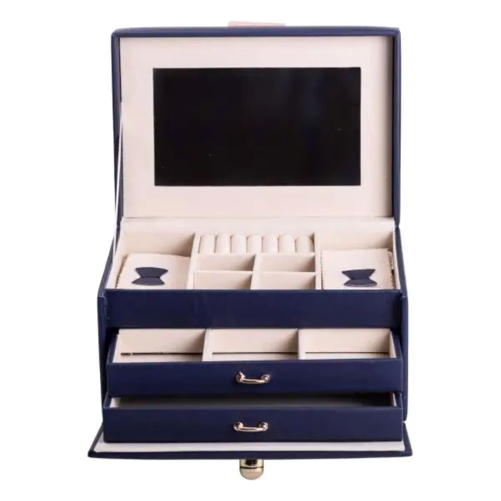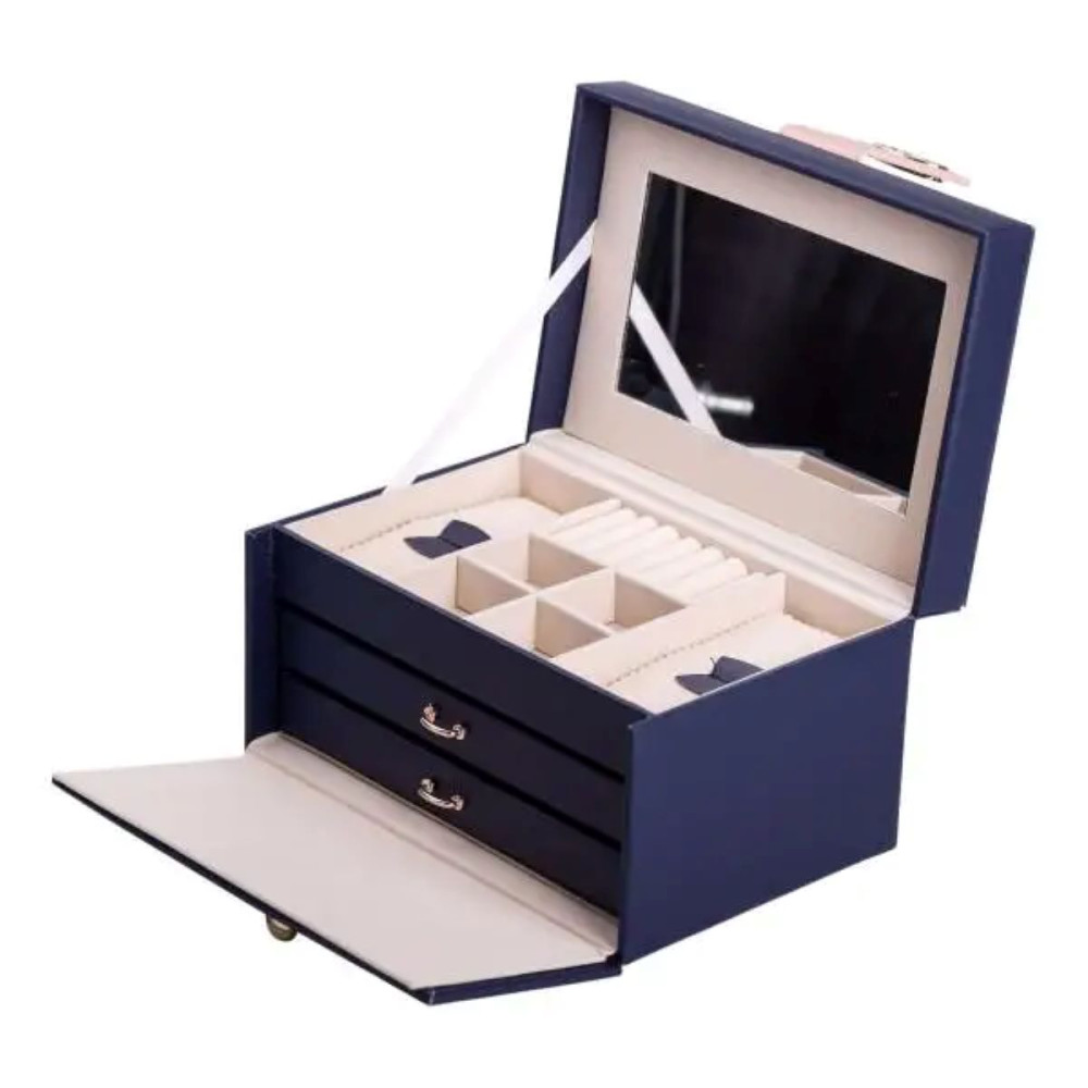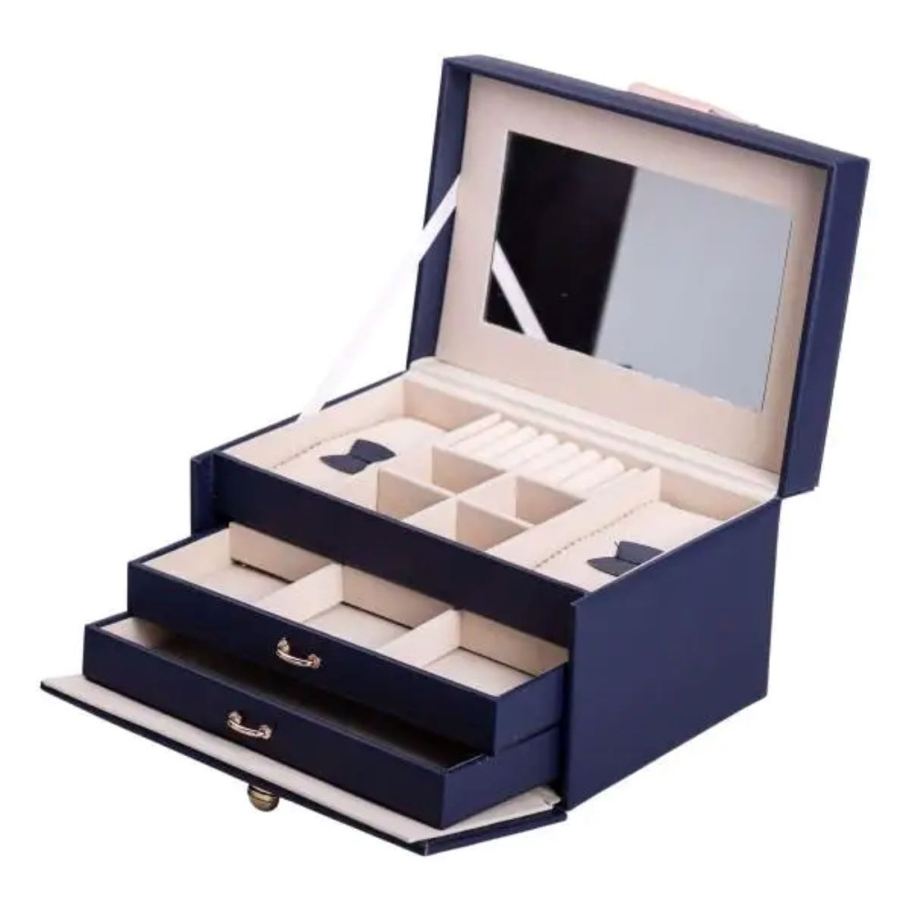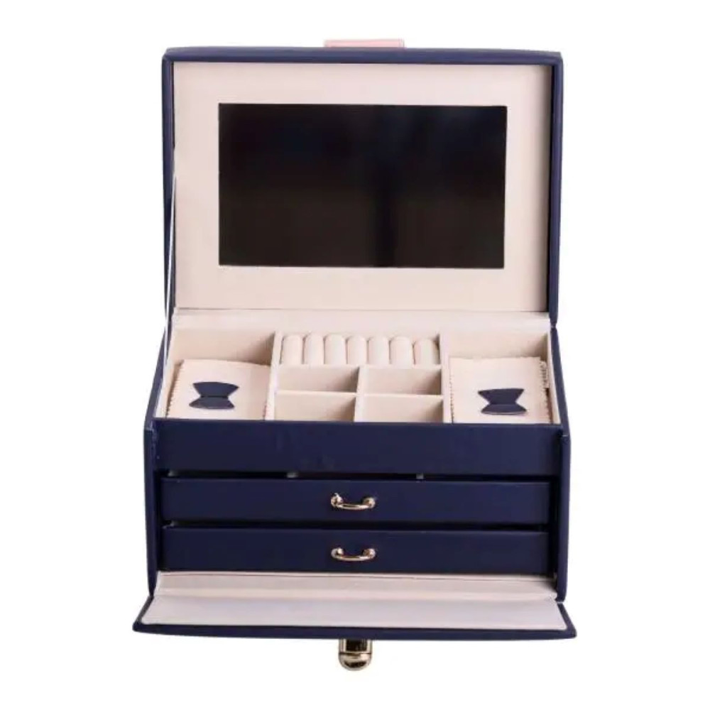 Немає відгуків про товар Шкатулка для украшений из эко кожи 3 яруса с зеркалом органайзер для ювелирных изделий HP-5-17BL