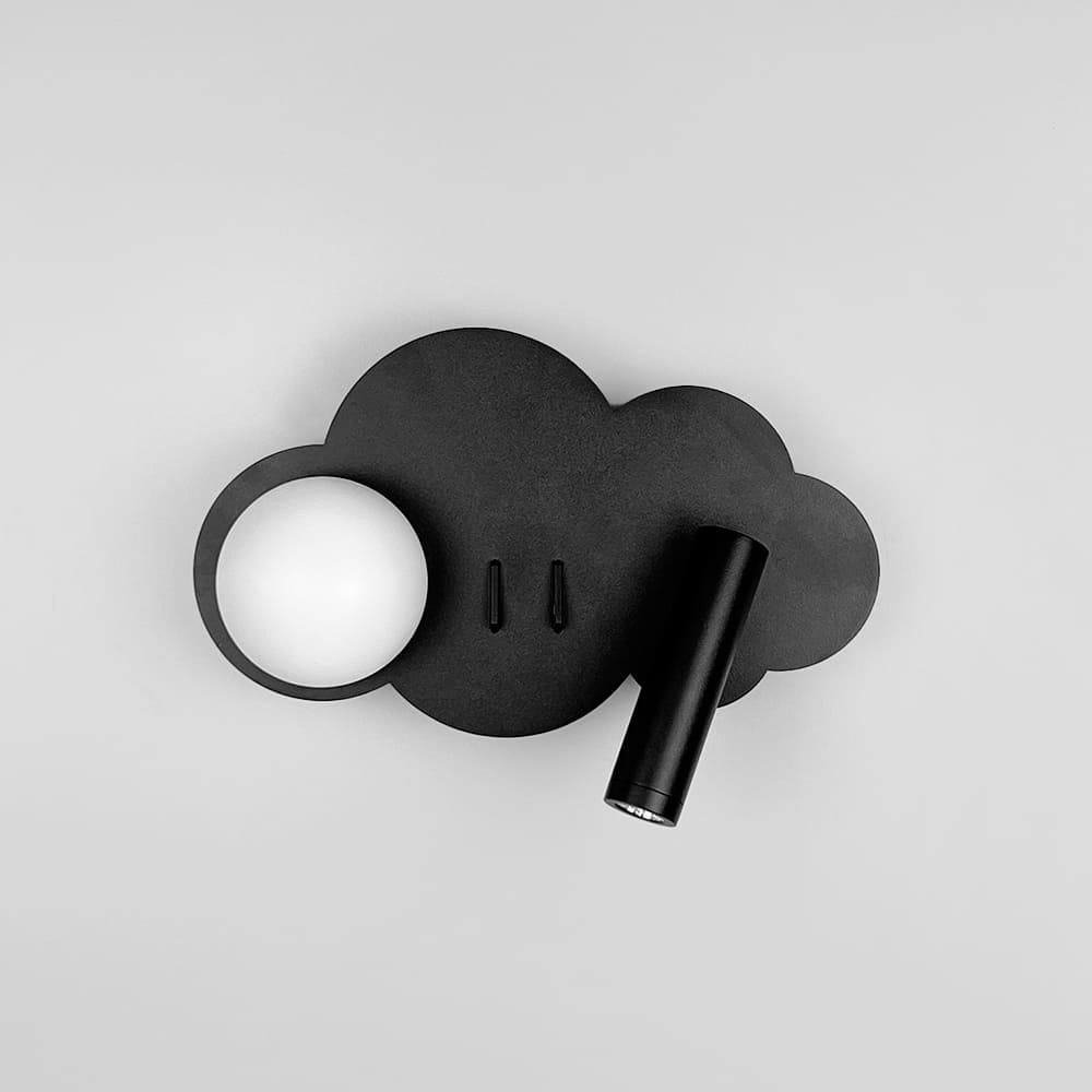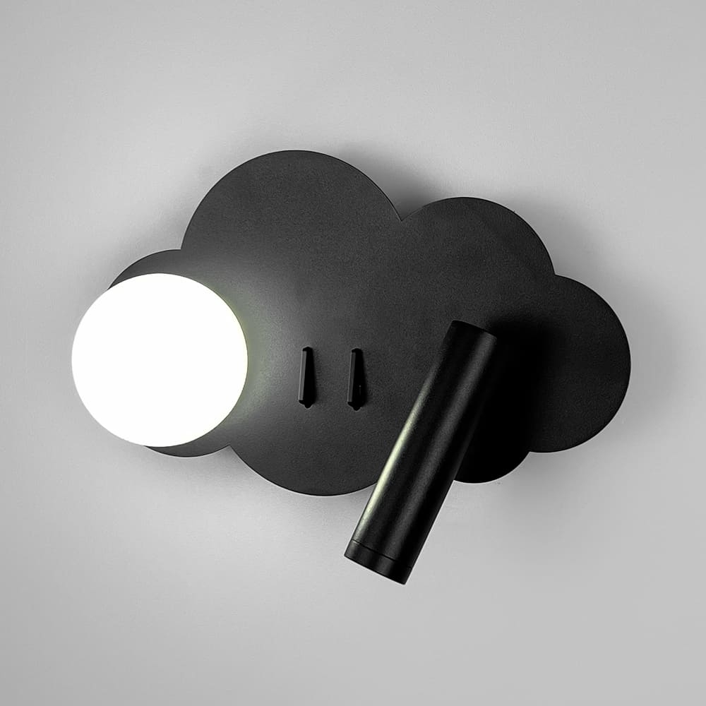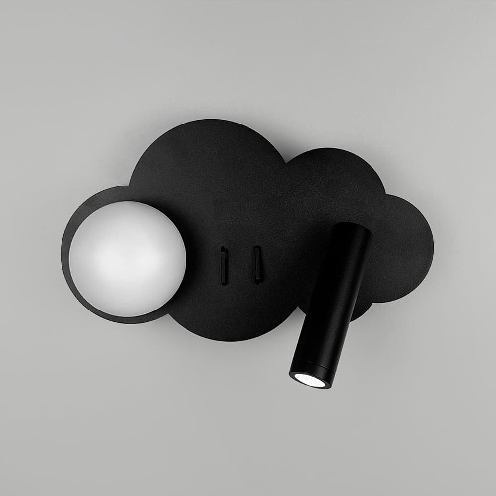 Настінний LED світильник Бра в сучасному стилі з металевим корпусом у вигляді хмарки, оснащений двома вимикачами і двома джерелами світла у вигляді світлодіодного споту циліндричної форми з поворотним механізмом, та акрилового плафона-кулі з правого боку.