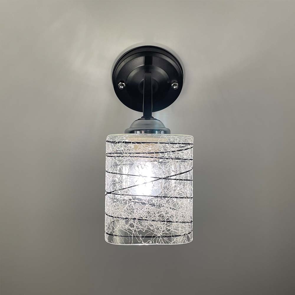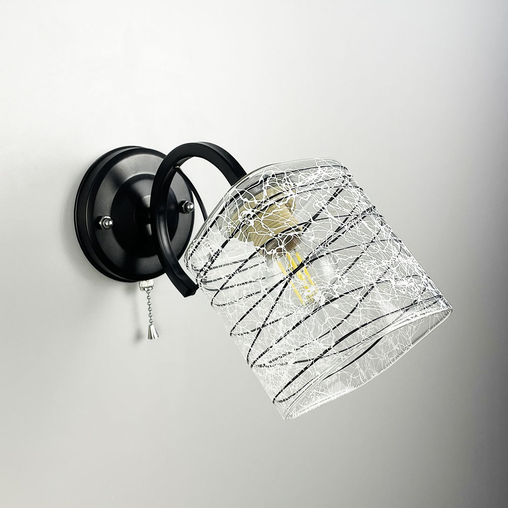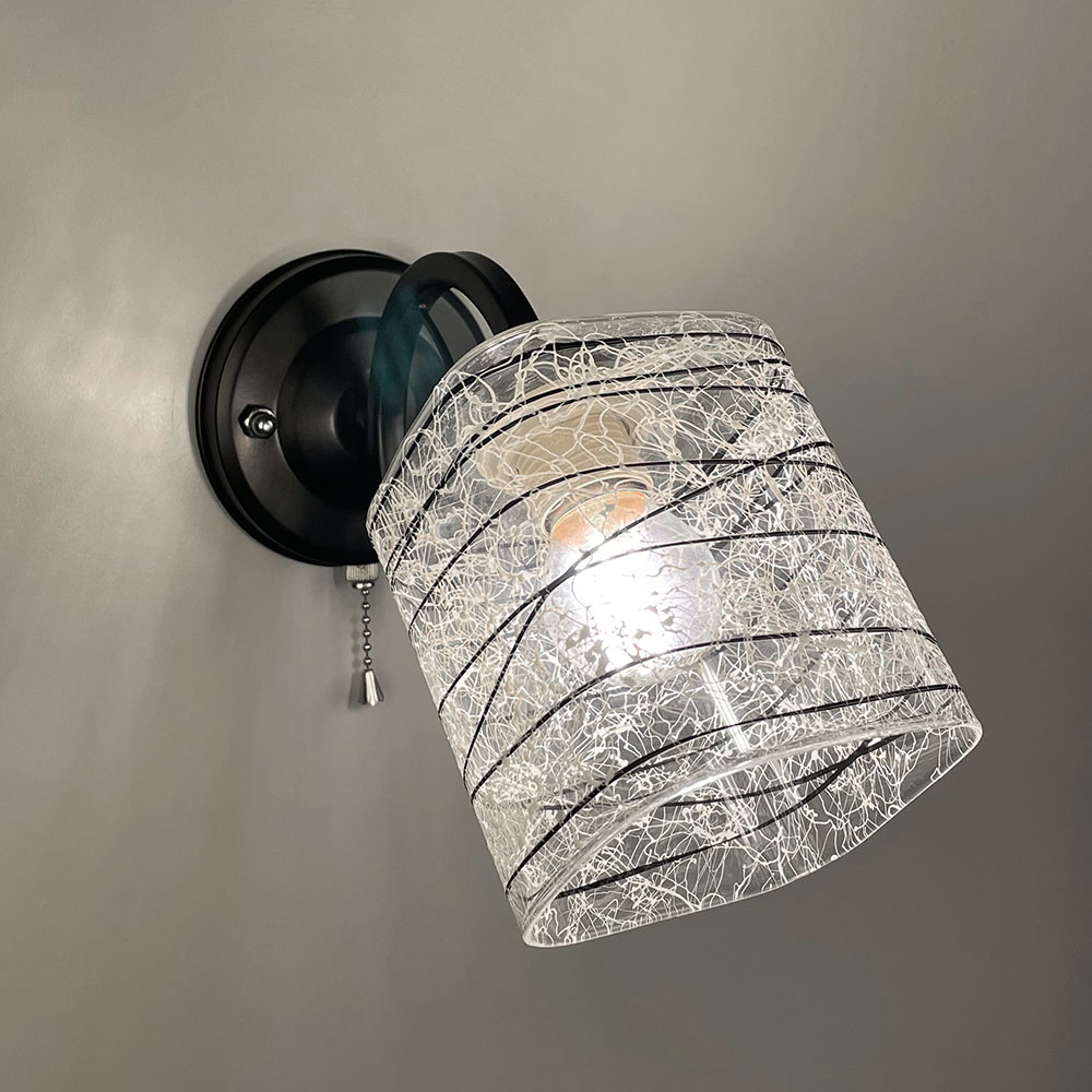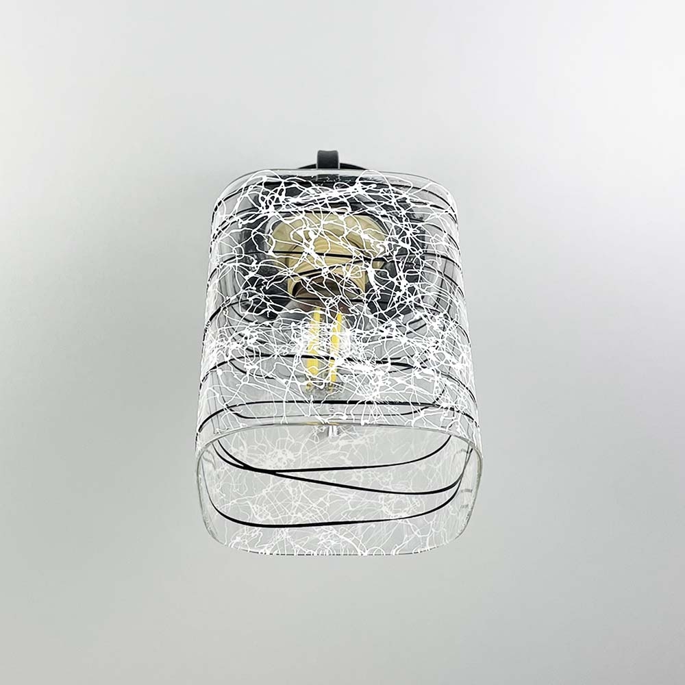 Світильник у чорному металевому корпусі, оснащений одним плафоном розміром 12х10 см. Плафон виготовлений з прозорого скла, прикрашеного стильними чорно-білими візерунками.