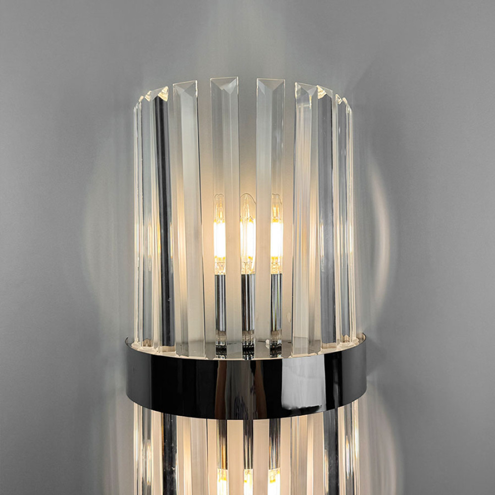 Розкішна кришталева бра в корпусі метал кольору хром з скляними, видовженими камінчиками, що фіксуються на прозорих гумках Модель на дві лампи, цоколь Е14