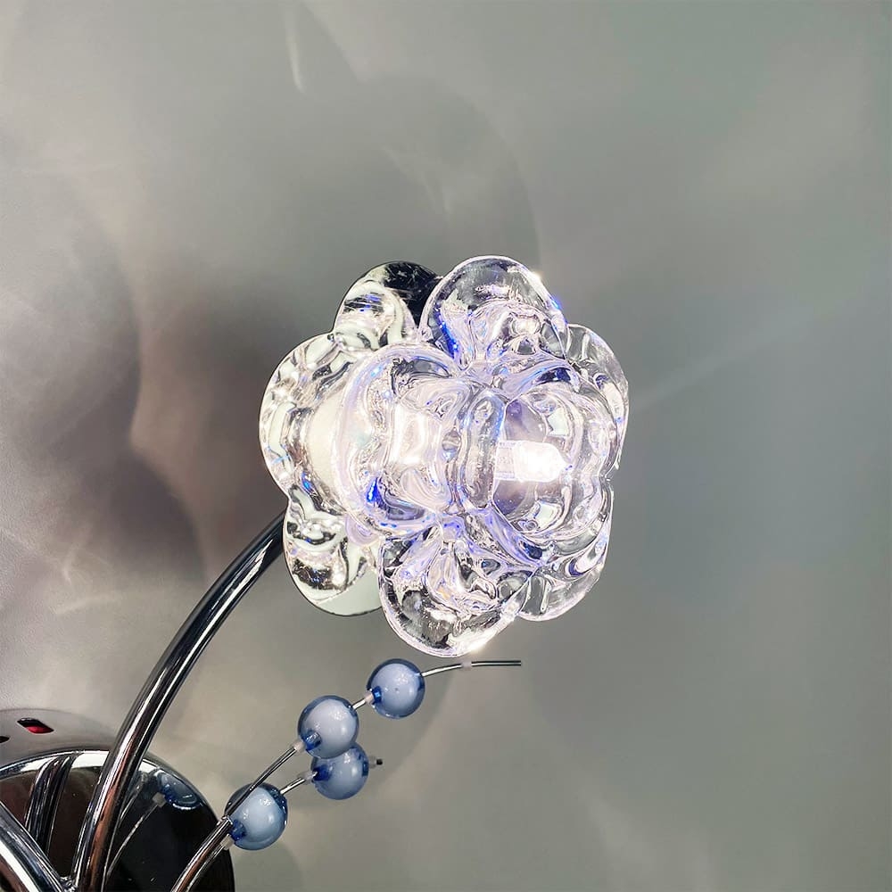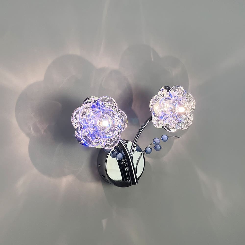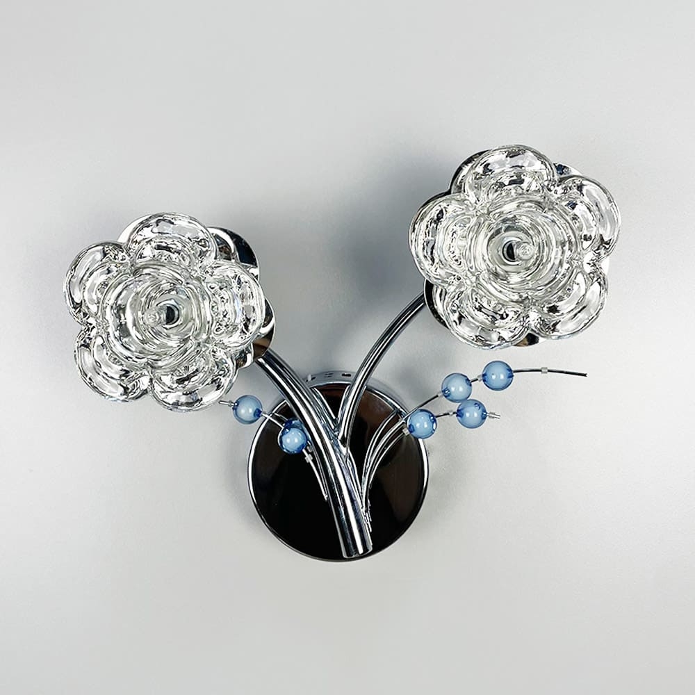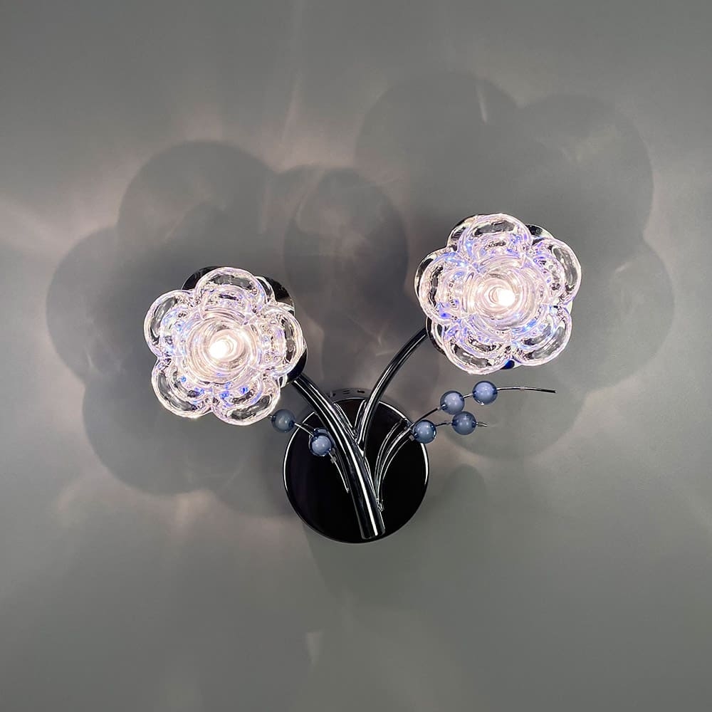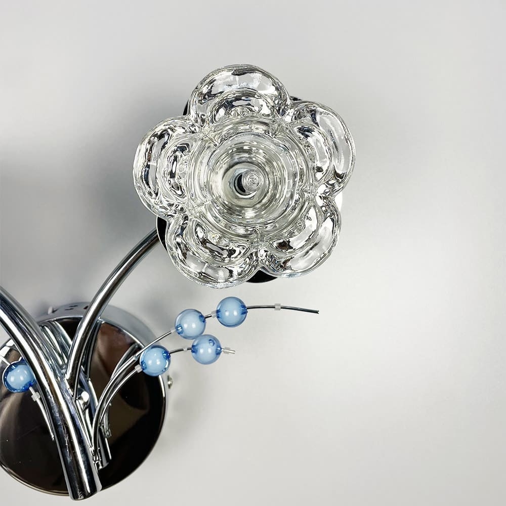 Це чарівне бра у милому квітковому стилі стане справжньою прикрасою вашого інтер'єру. На круглій металевій основі, доступній у двох кольорах — золотому або хромованому, розташовані дві витончені гілочки, які імітують ніжні квіти. Плафони у формі пелюстків, виконані зі скла, створюють ефект мерехтіння та додають світильнику легкості й романтики. Світильник оснащений вбудованими світлодіодами та галогенними лампочками (12В), що входять у комплект. Загальна потужність становить 34 Вт, чого цілком достатньо для затишного освітлення невеликих кімнат або зон відпочинку. Компактні розміри бра (висота 20 см, ширина 26 см, відступ від стіни 10 см) роблять його універсальним рішенням для декору спальні, вітальні чи навіть дитячої кімнати. Поєднання витонченого дизайну у вигляді квітів та металевого корпусу дозволяє гармонійно інтегрувати світильник у будь-який стиль інтер'єру. Це бра — ідеальний вибір для створення теплої та романтичної атмосфери у вашому домі.