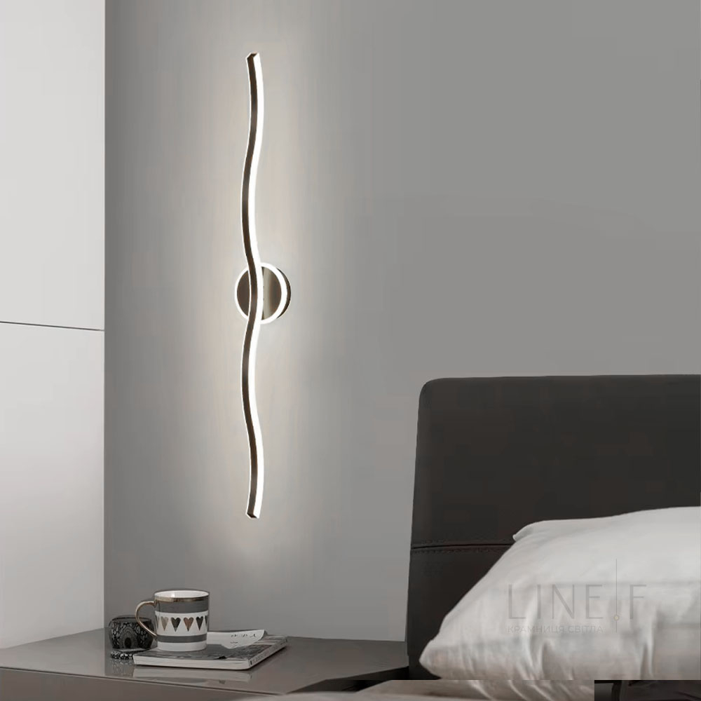 Сучасні лінійні бра, які не лише виконують функцію освітлення, але і є стильним елементом інтер’єру. Металева конструкція бра складається із круглої стінової основи та довгої вигнутої планки у хвилеподібній формі. Бра оснащені вбудованими світлодіодами, які розташовані під розсіювачем вздовж всієї довжини (основи та планки) і випромінюють нейтральне світло з температурою 4000К. Модель доступна у 2-х варіантах кольору корпусу: чорний та латунь, а також у 3-х розмірах: 60 см, 80 см та 100 см. Основна перевага цих бра полягає в можливості встановлення під потрібним кутом - горизонтально або вертикально.