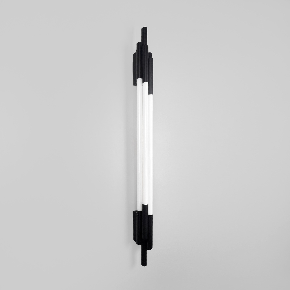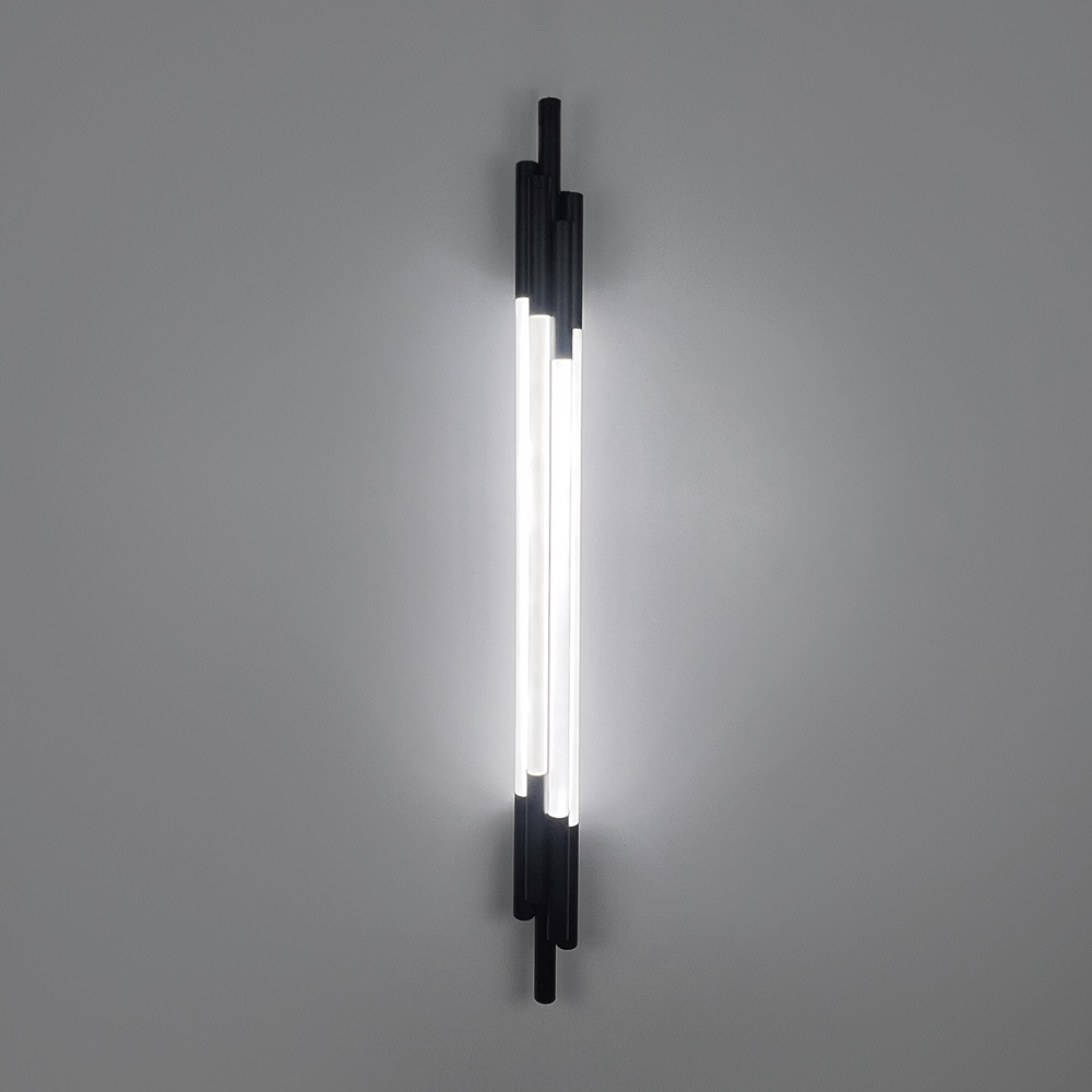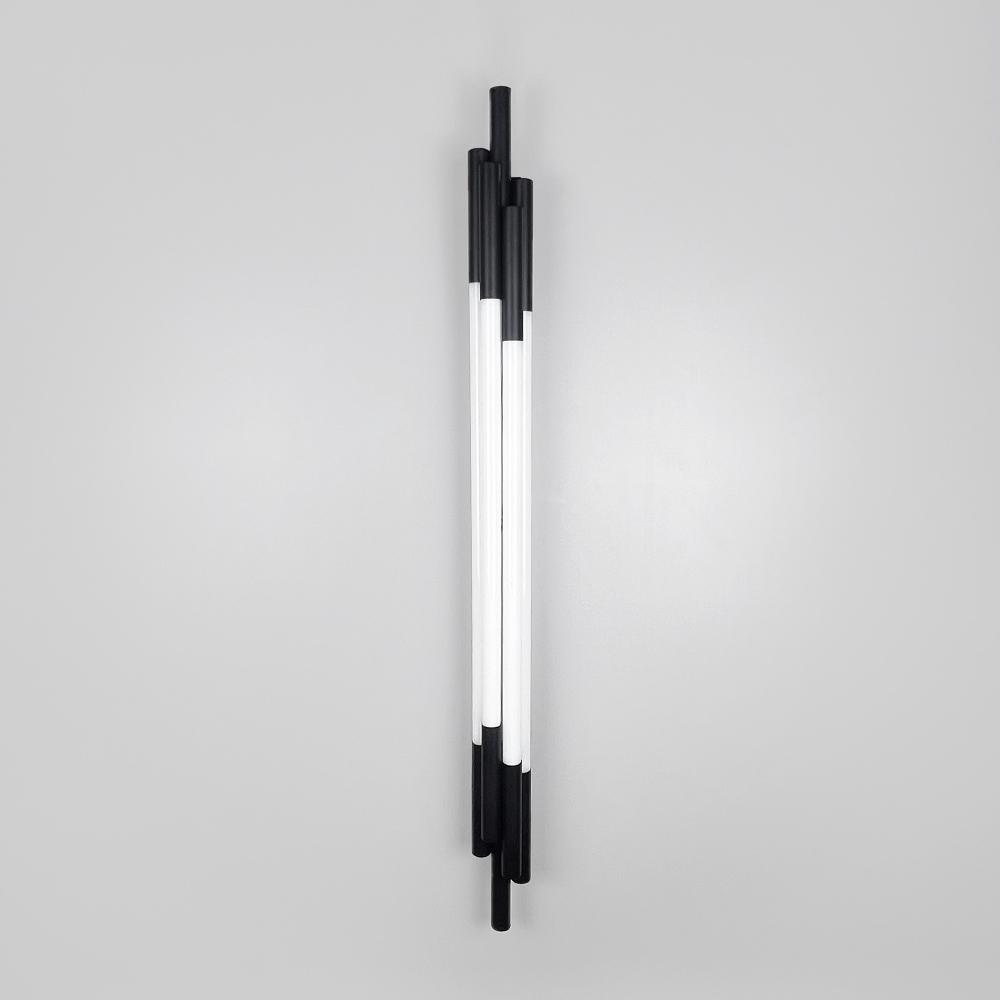 Лінійний стіновий LED світильник-бра з білою акриловою світловою частиною та металевими закінченнями поєднує сучасний дизайн з елегантністю. Його конструкція нагадує скупчення білих світлових трубок, що розташовані на різній відстані одна від одної, надаючи світильнику динамічного характеру та привертаючи увагу. Світлодіоди приховані під акриловою поверхнею та підтримують три режими освітлення: тепле, нейтральне та холодне світло, що дозволяє створювати різноманітні атмосферні ефекти залежно від потреб. Серія представлена в двох кольорах металевих деталей — чорний та латунь, а також у трьох довжинах: 90 см, 110 см та 130 см. Світильники чудово поєднуються між собою, тому їх можна використовувати як самостійний акцент або створювати цікаві світлові композиції, комбінуючи різні розміри та кольори.