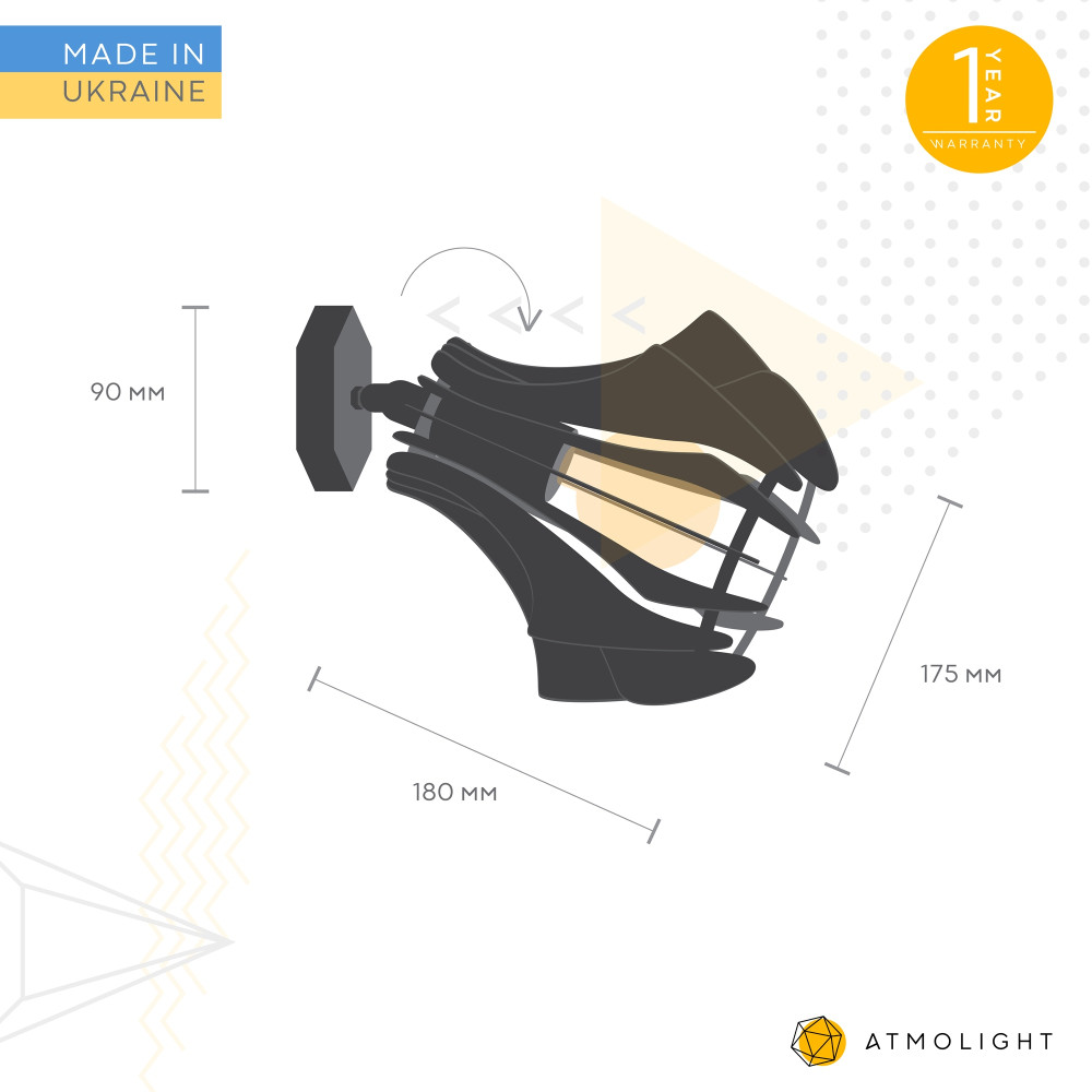 Настінний світильник бра має декоративний металевий плафон чорного кольору. Плафон з поворотним механізмом, виготовлений із тонких (менш 1мм) металевих пластин вирізаних лазером. Дизайн бра ідеально вписується в стиль лофт. Світильники забарвлені порошковою фарбою.