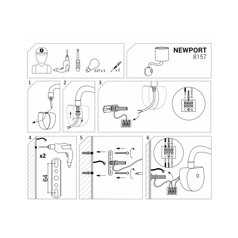 Технічні характеристики Бра Nowodvorski 8157 Newport Е14 1x40W IP20 Wh: