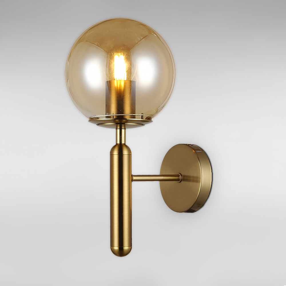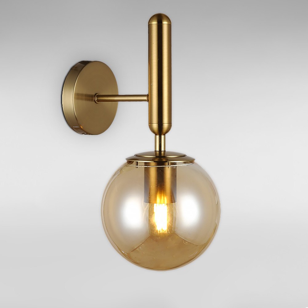 Стильний настінний світильник Бра на одну лампу зі скляним плафоном у вигляді кулі.