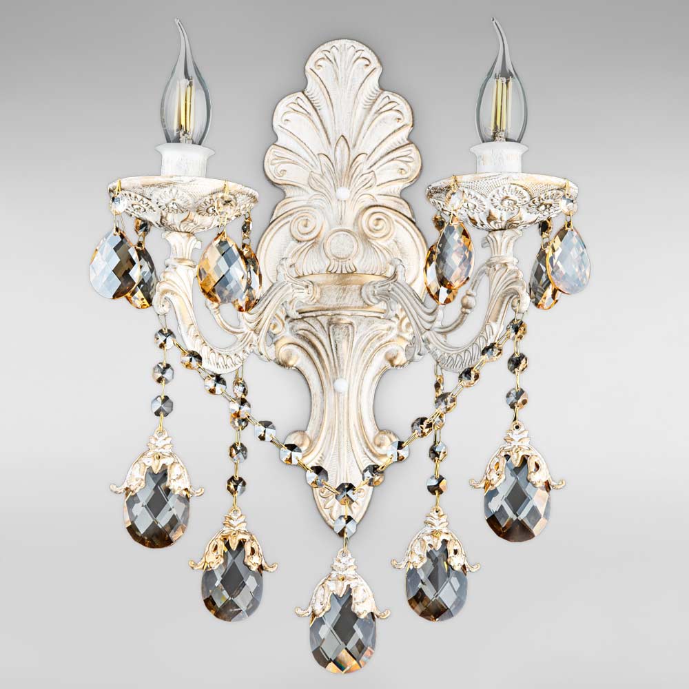 Декоративний настінний світильник бра у вигляді підсвічника на дві лампи свічки з кришталевими підвісками. Виконаний у класичному стилі.