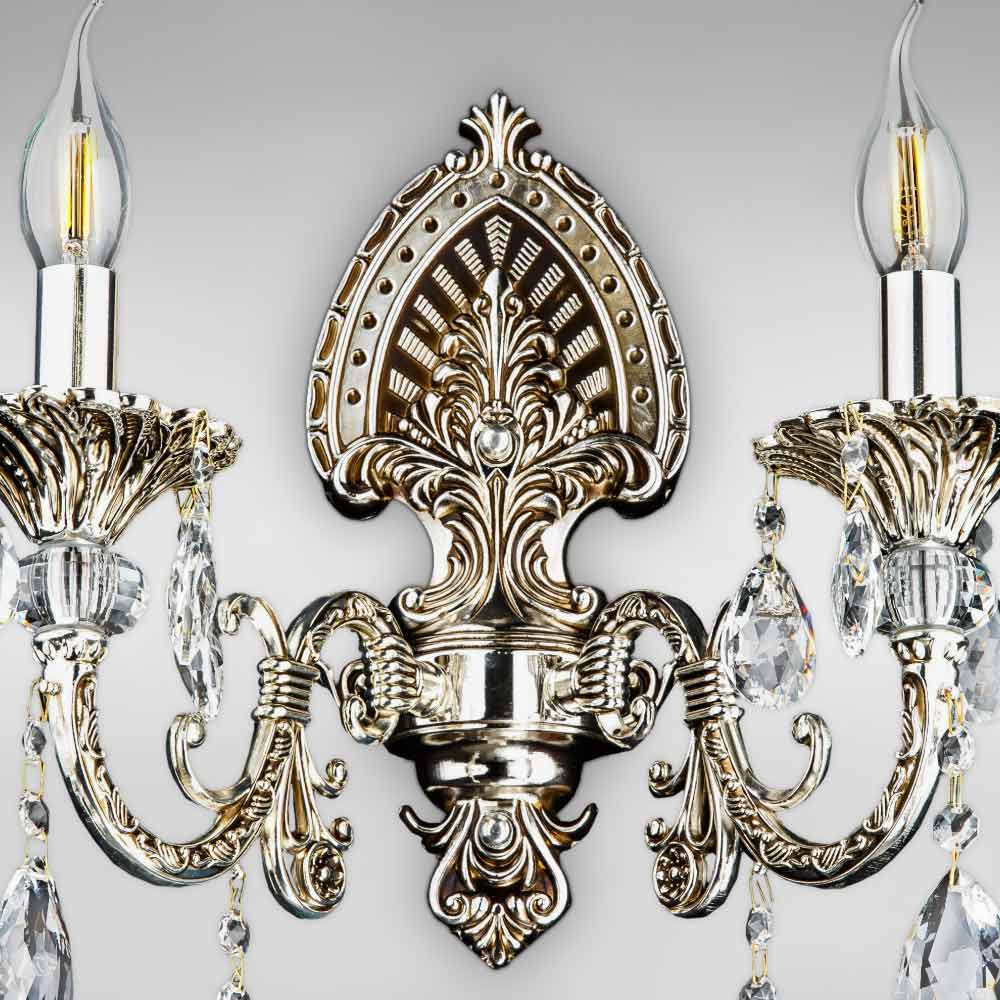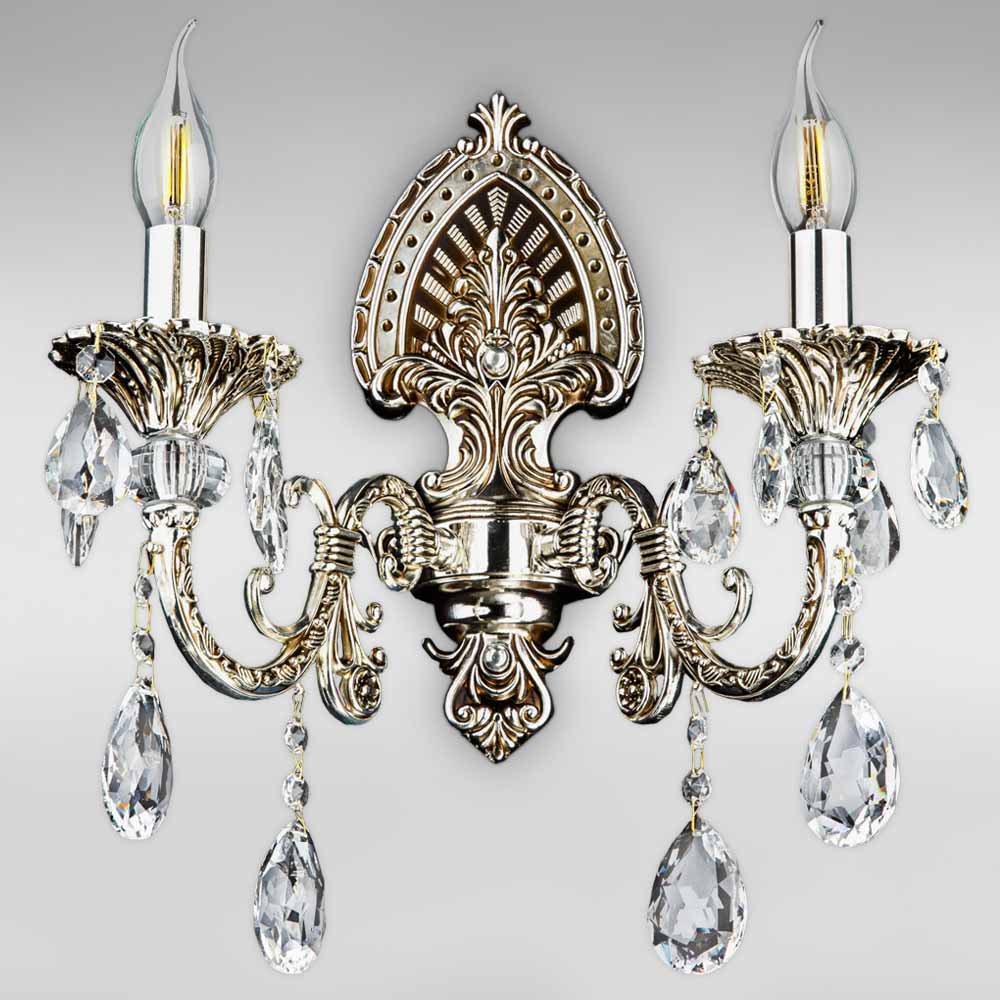 Декоративний настінний світильник бра у вигляді свічника на дві лампи свічки з кришталевими підвісками. Виконаний у класичному стилі.