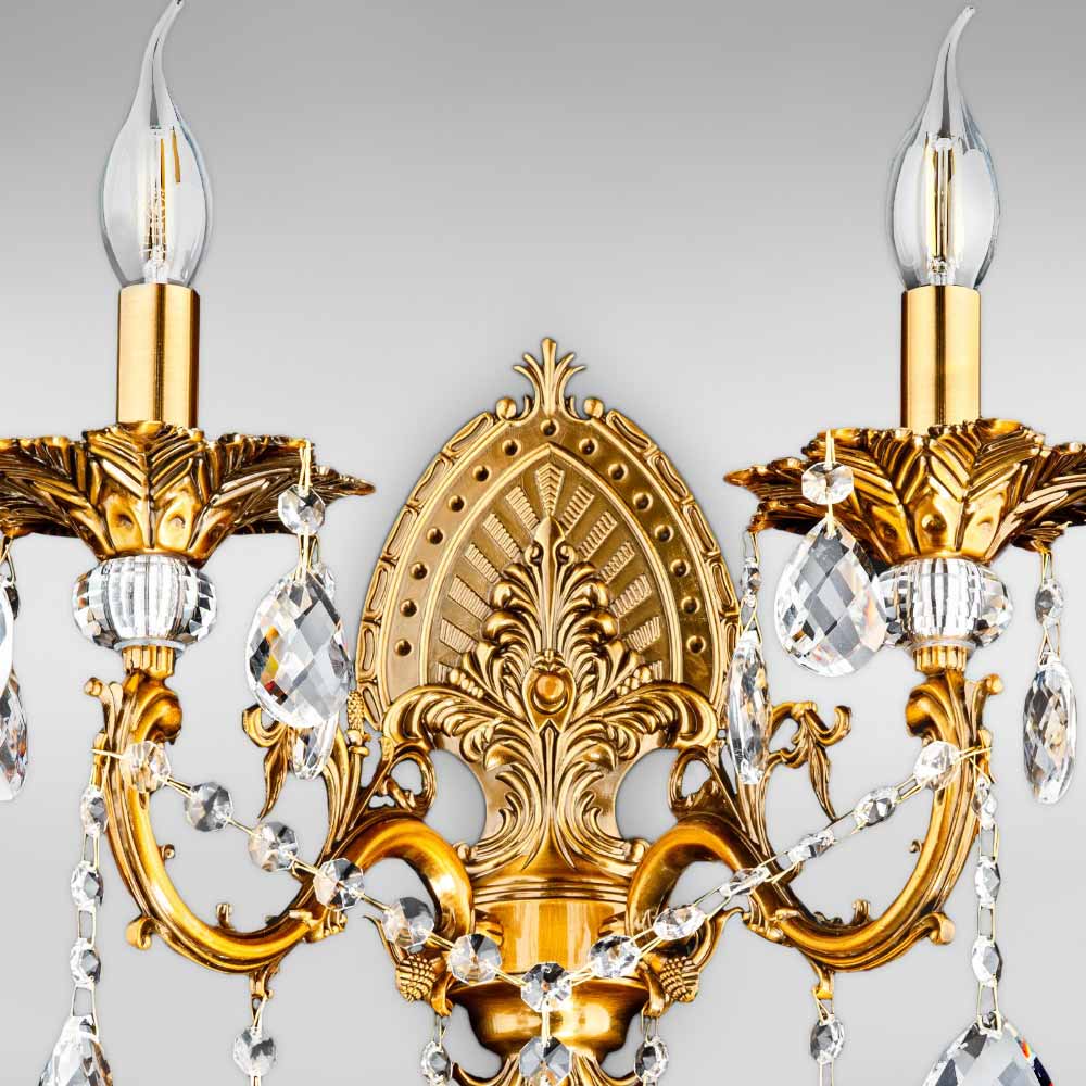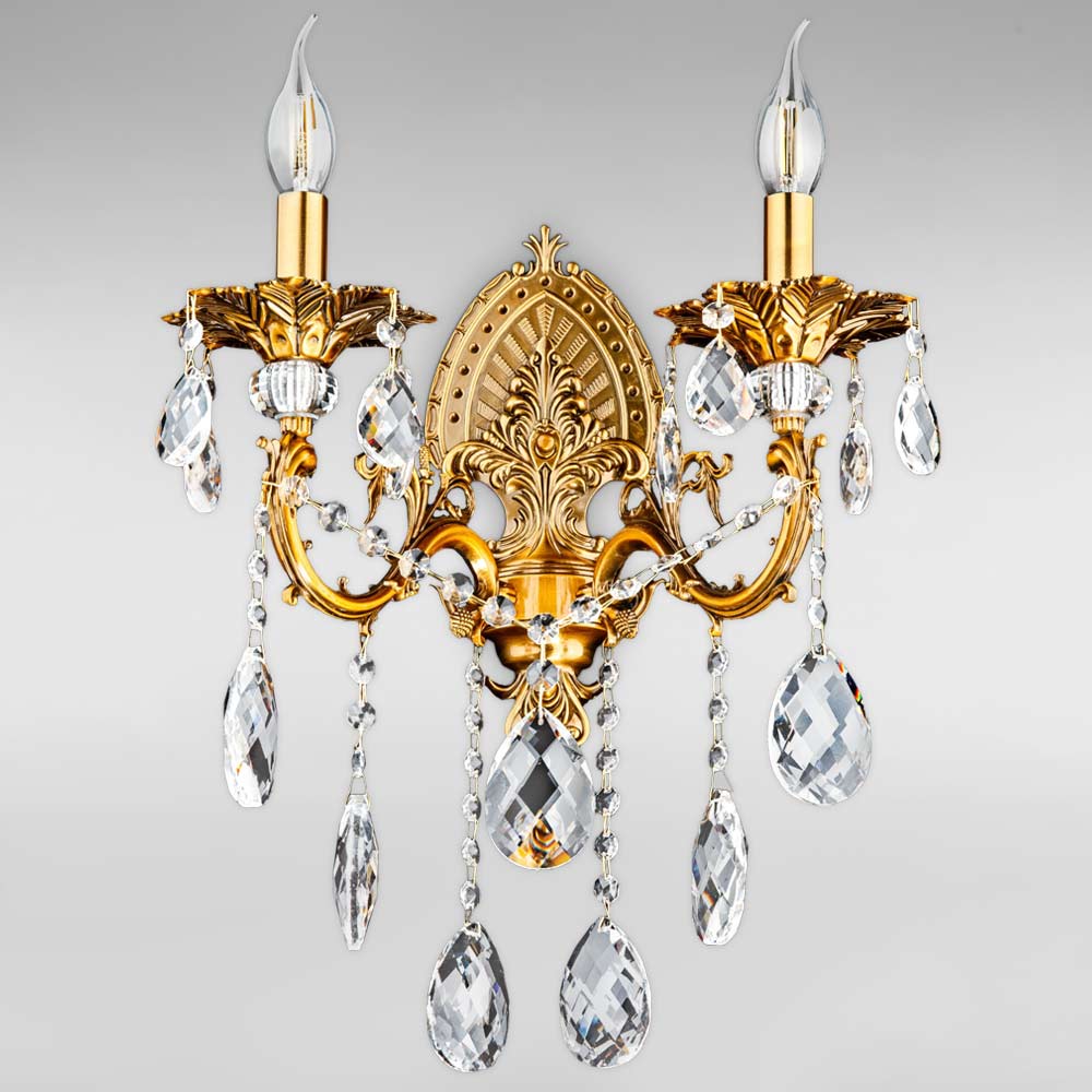 Декоративний настінний світильник бра у вигляді свічника на дві лампи свічки з кришталевими підвісками. Виконаний у класичному стилі.