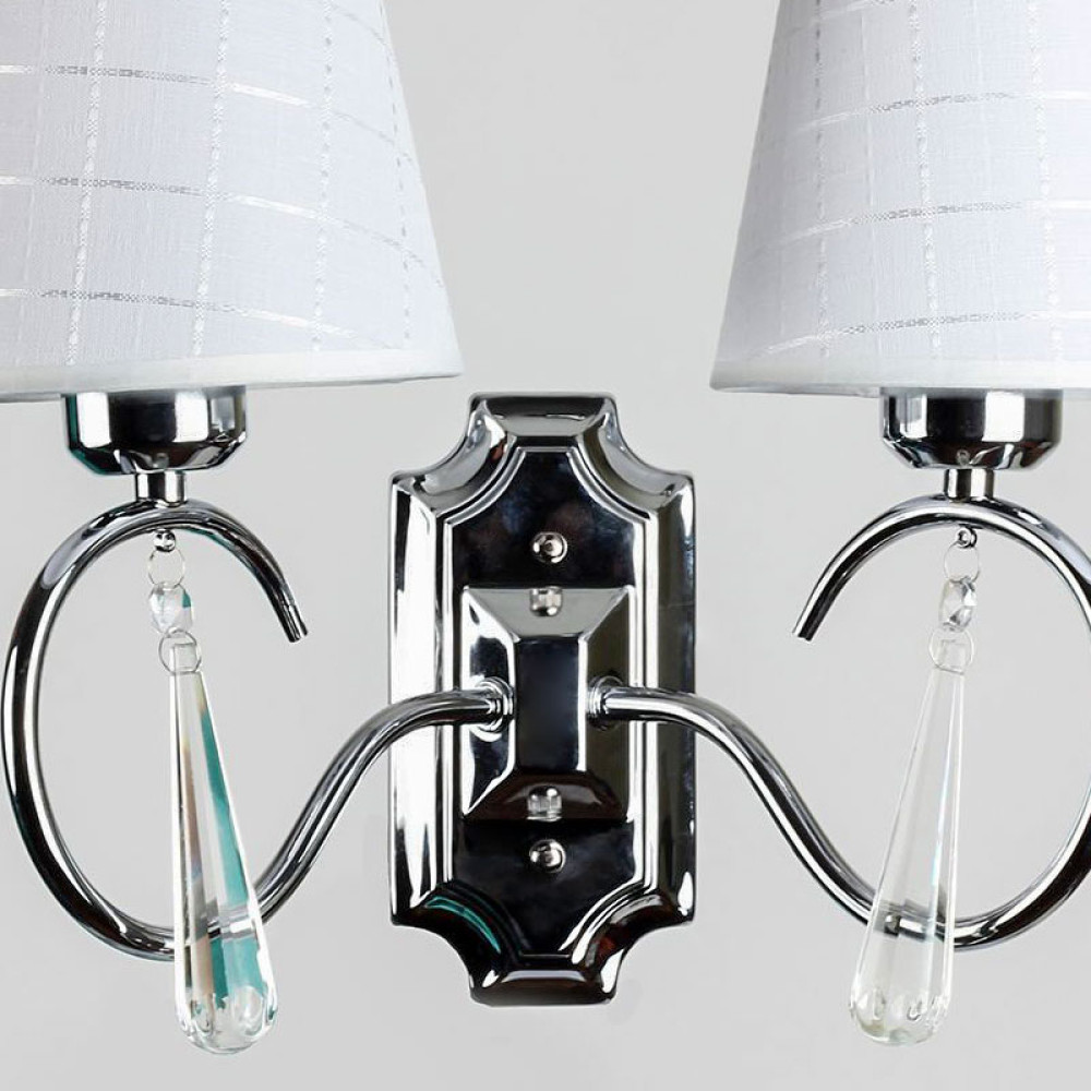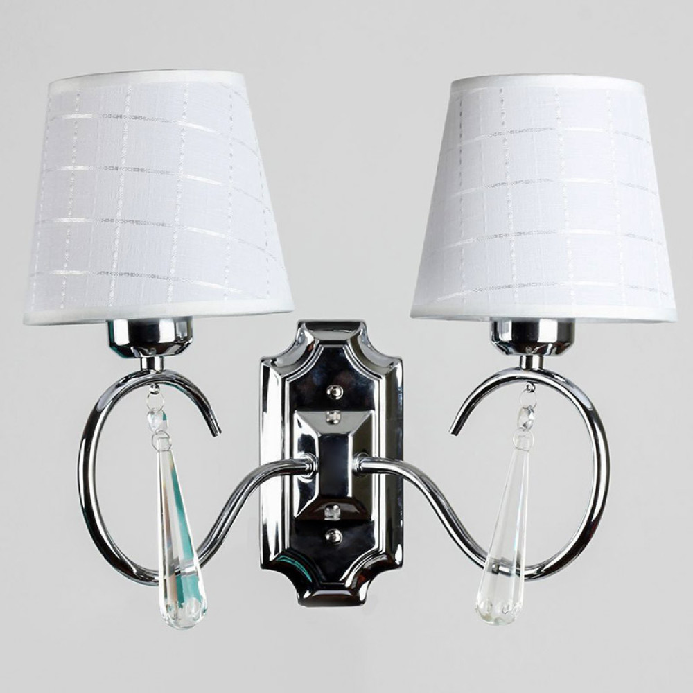 Бра на дві лампи в класичному стилі з абажурами з тканини і скляними підвісками.