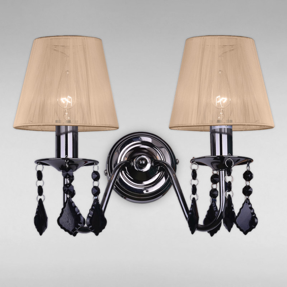 Бра на дві лампи в класичному стилі з абажурами з тканини і скляними підвісками.