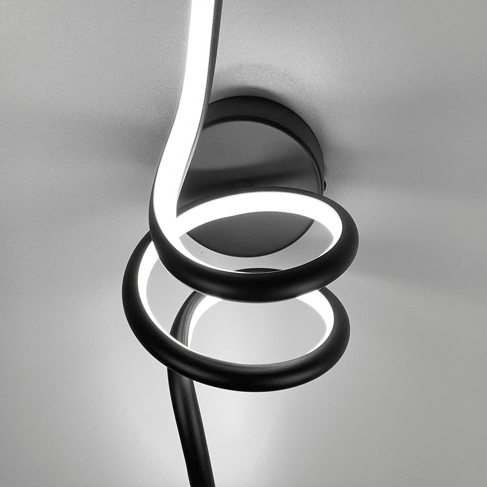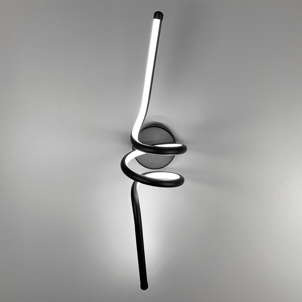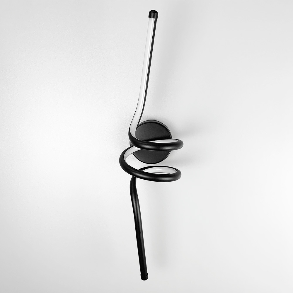 Сучасний декоративний настінний світлодіодний світильник у металевому корпусі з джерелом світла у вигляді спірал.Довжина 60 см. Ширина 13 см, відступ від стіни – 16 см. Світильник має вбудовані світлодіоди із нейтральним денним світлом.