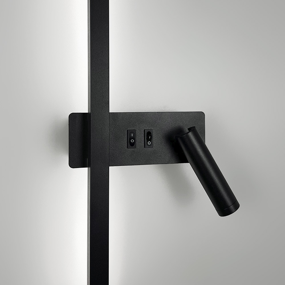 Світильник кріпиться на прямокутну стінову основу (15×5 см), де розташовані два зручні вимикачі для окремого керування основним світлом та спотом.