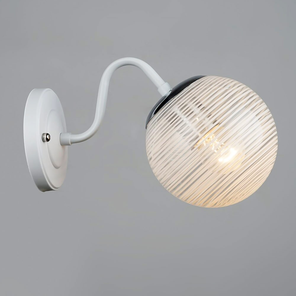 Каркас бра виготовлений з металу в білому, створюючи елегантний та сучасний вигляд. Один круглий плафон зі скла в білому та прозорому відтінку надає бра витонченості та сучасного стилю. Плафон спрямований вниз, забезпечуючи приємне та ефективне освітлення.