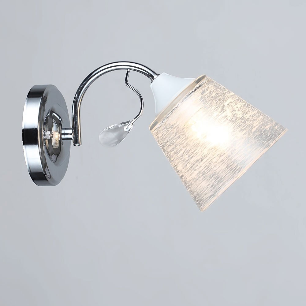 Сучасний настінний світильник Бра на одну лампу, зі скляним плафоном трапецієподібної форми. Прозорий плафон прикрашений білим декоративним візерунком: що забезпечує м'яке та розсіяне освітлення.
