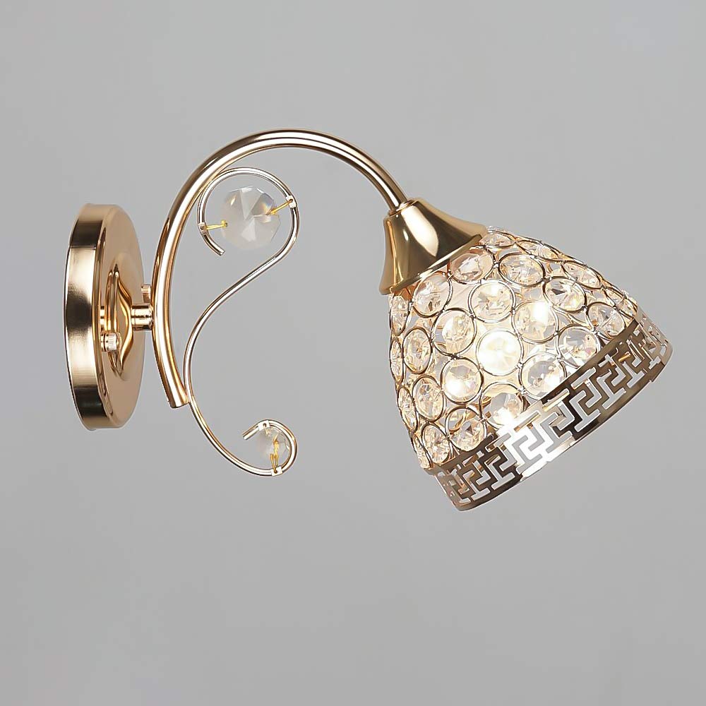 Стильний настінний світильник Бра на одну лампу з металевим плафоном конусної форми з кришталевими вставками: що забезпечить вишуканий блиск та створить цікаву гру світла та тіні при включеному джерелі світла.