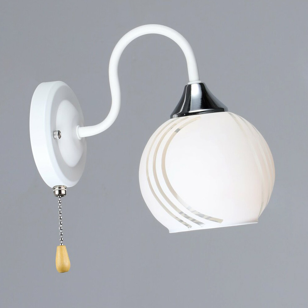 Стильний настінний світильник Бра на одну лампу зі скляним плафоном круглої форми та мотузковим вимикачем на корпусі.