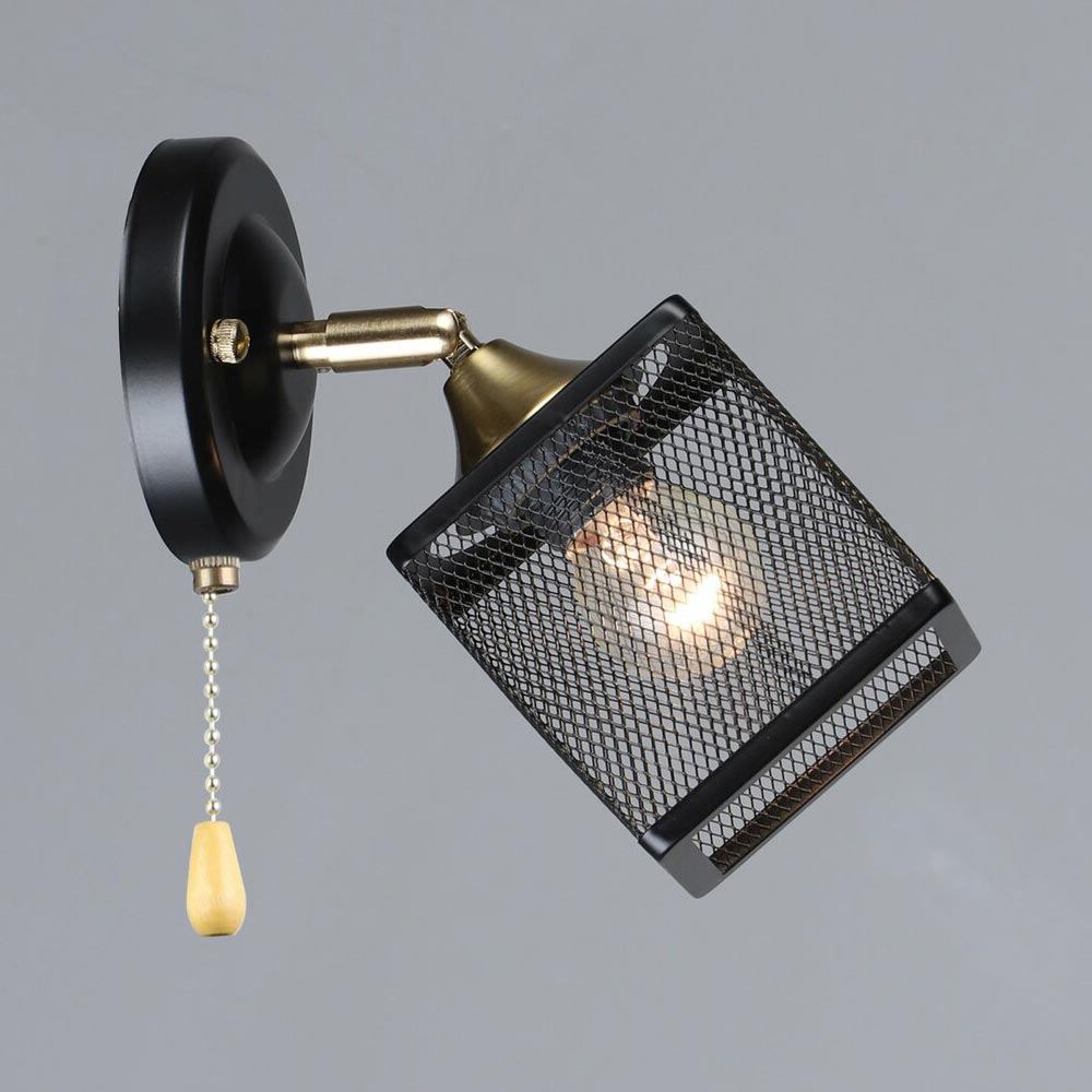 Стильний настінний світильник Бра на одну лампу з металевим плафоном кубічної форми у вигляді сітки, оснащений поворотним механізмом і мотузковим вимикачем. Це елегантний настінний світильник у поєднанні чорного кольору з мідними елементами, який стане стильним доповненням до інтер'єру у сучасному, лофт чи індустріальному стилі. Ідеально підходить для локального освітлення у спальні, коридорі, вітальні чи кафе.