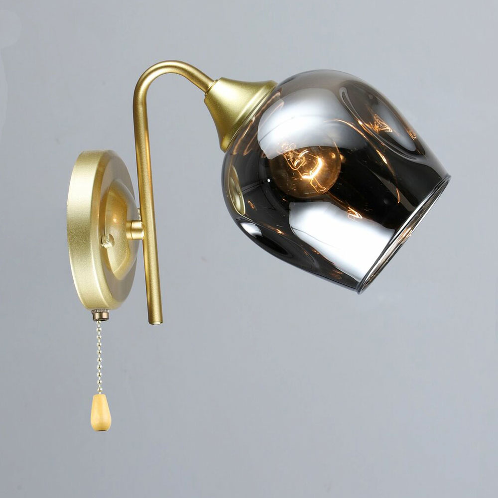 Сучасний настінний світильник Бра на одну лампу зі скляним плафоном округлої форми оснащений мотузковим вимикачем на корпусі.