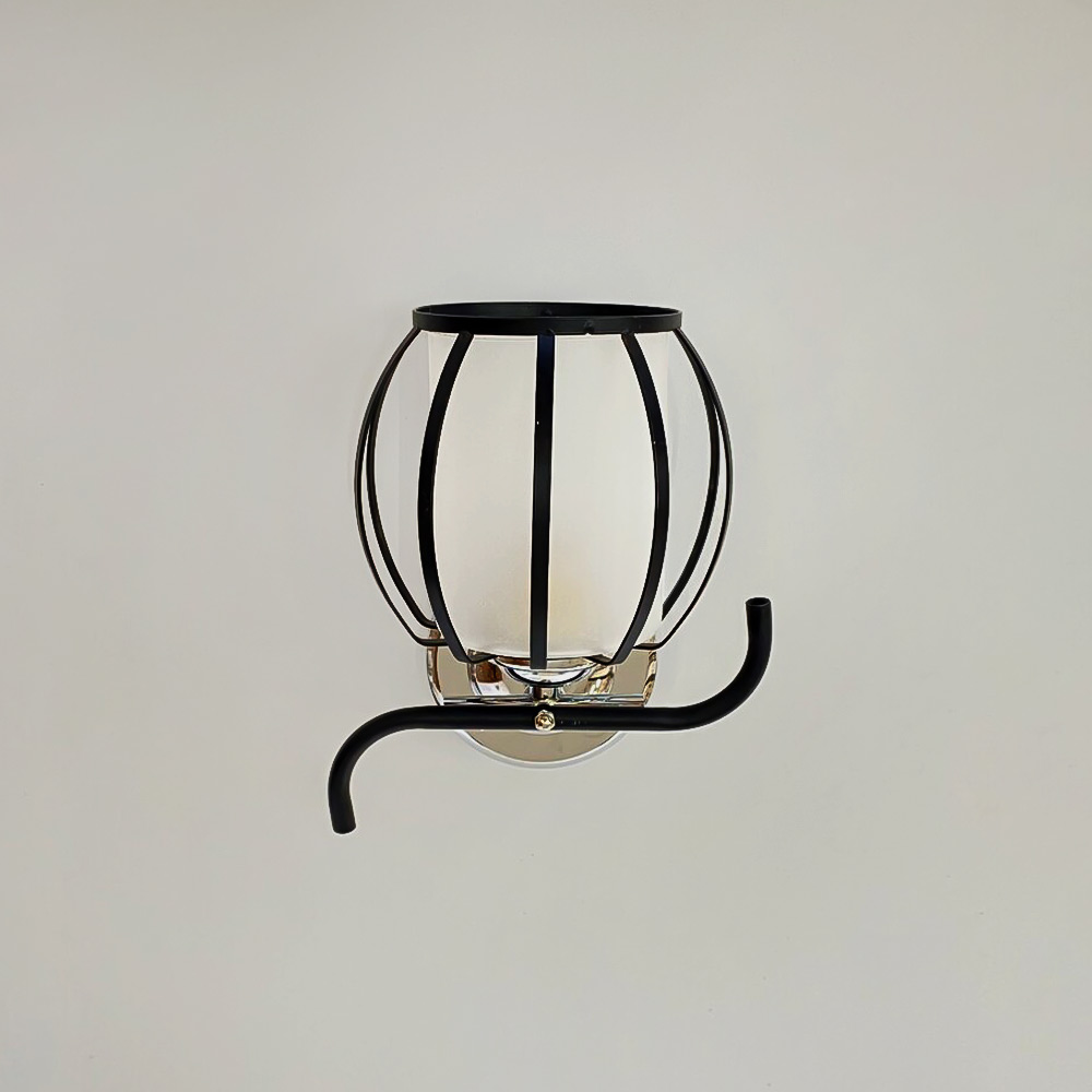 Сучасний настінний світильник Бра на одну лампу з подвійним плафоном: зовнішня частина у вигляді металевої клітини округлої форми, внутрішній плафон зі скла циліндричної форми. Така незвичайна конструкція створює цікаву гру світла і тіні при включеному джерелі світла і забезпечить ідеальне доповнення до інтер'єру, який вимагає акцентного або додаткового освітлення.