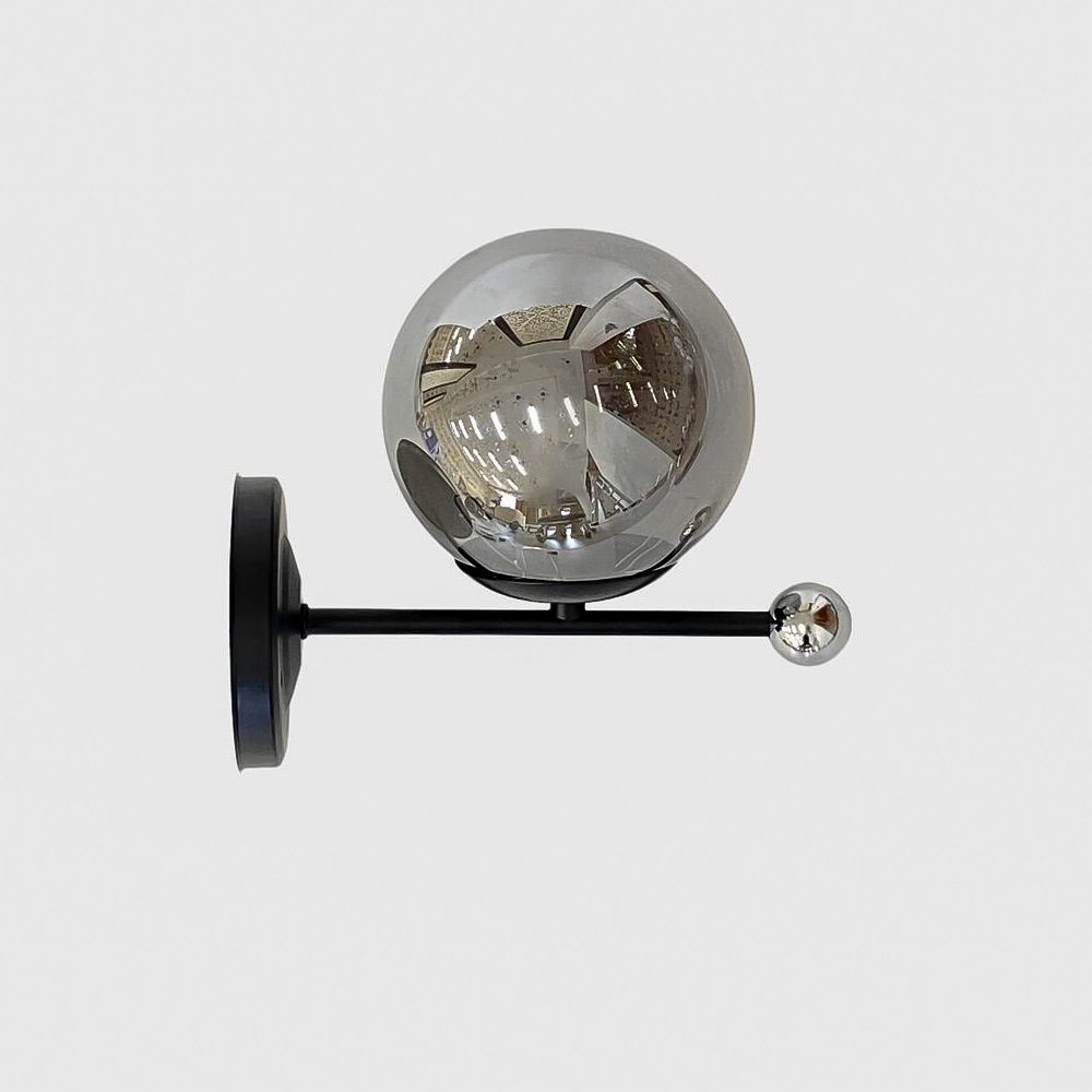 Сучасний настінний світильник Бра на одну лампу зі скляним плафоном-кулькою та декоративною кулькою на корпусі. Це вишукане настінне бра - ідеальне доповнення до інтер'єру, що вимагає акцентного або додаткового освітлення. Завдяки лаконічному дизайну та вишуканому поєднанню чорного та хромованого кольору, воно чудово підійде для освітлення коридорів, спалень або створення акцентного світла біля дзеркала.