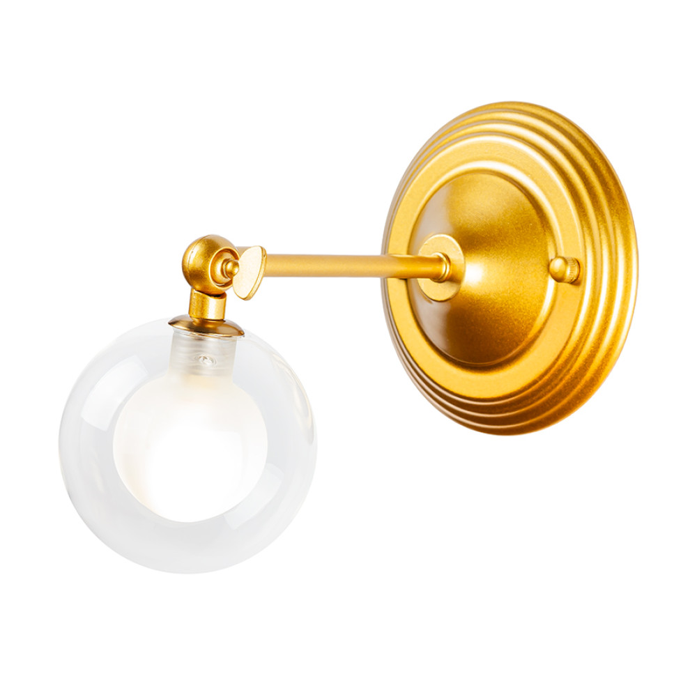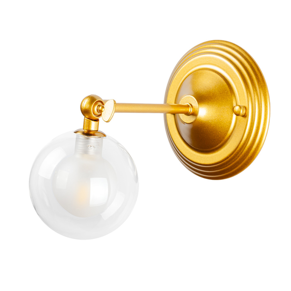 Стильний настінний світильник Бра-молекула на одну лампу зі скляним плафоном у вигляді кулі.Плафон подвійний, (зовнішній – прозорий, внутрішній – білий) оснащений поворотним механізмом. Компактний розмір та мінімалістичний дизайн роблять цю модель універсальним варіантом для кімнат, коридорів чи робочих зон.