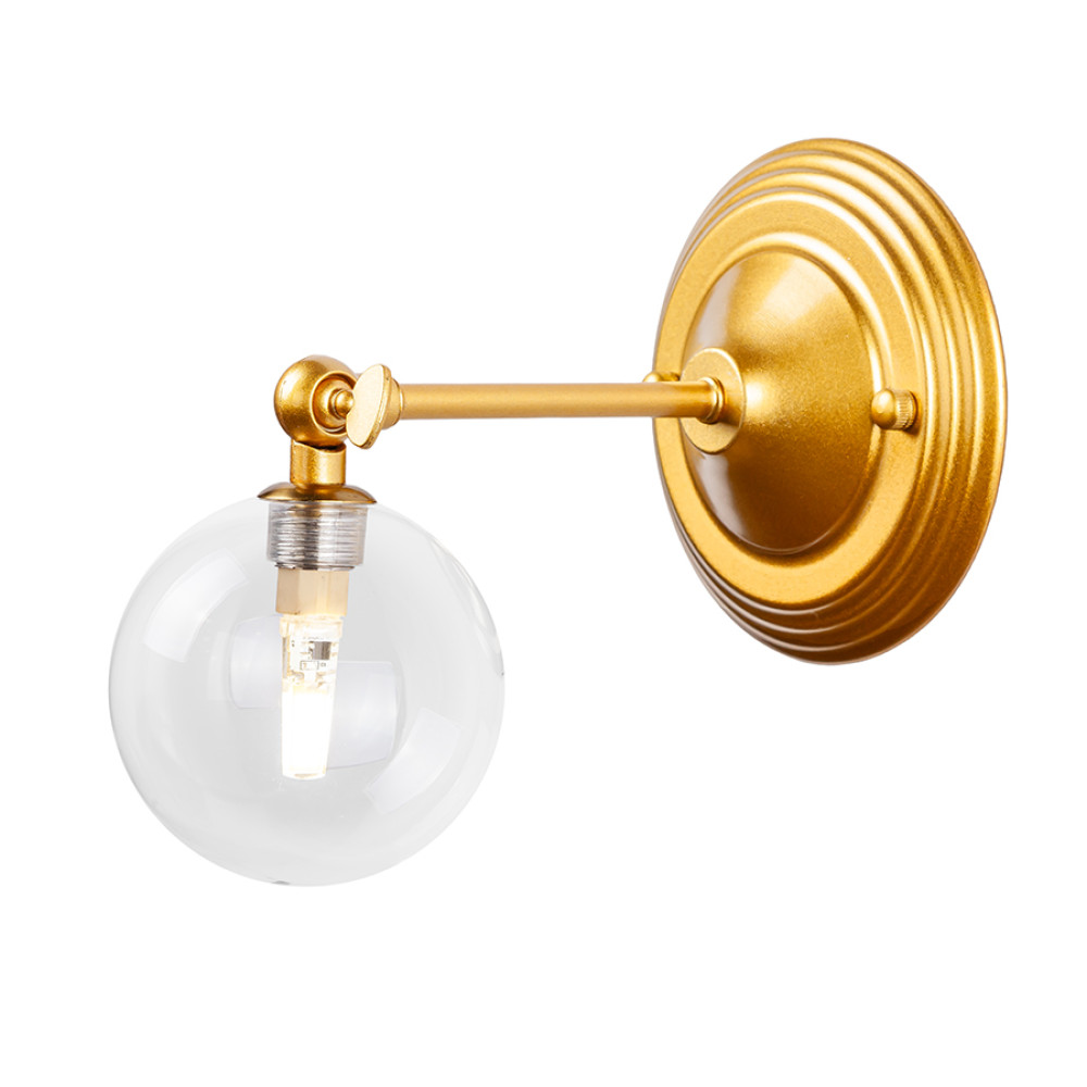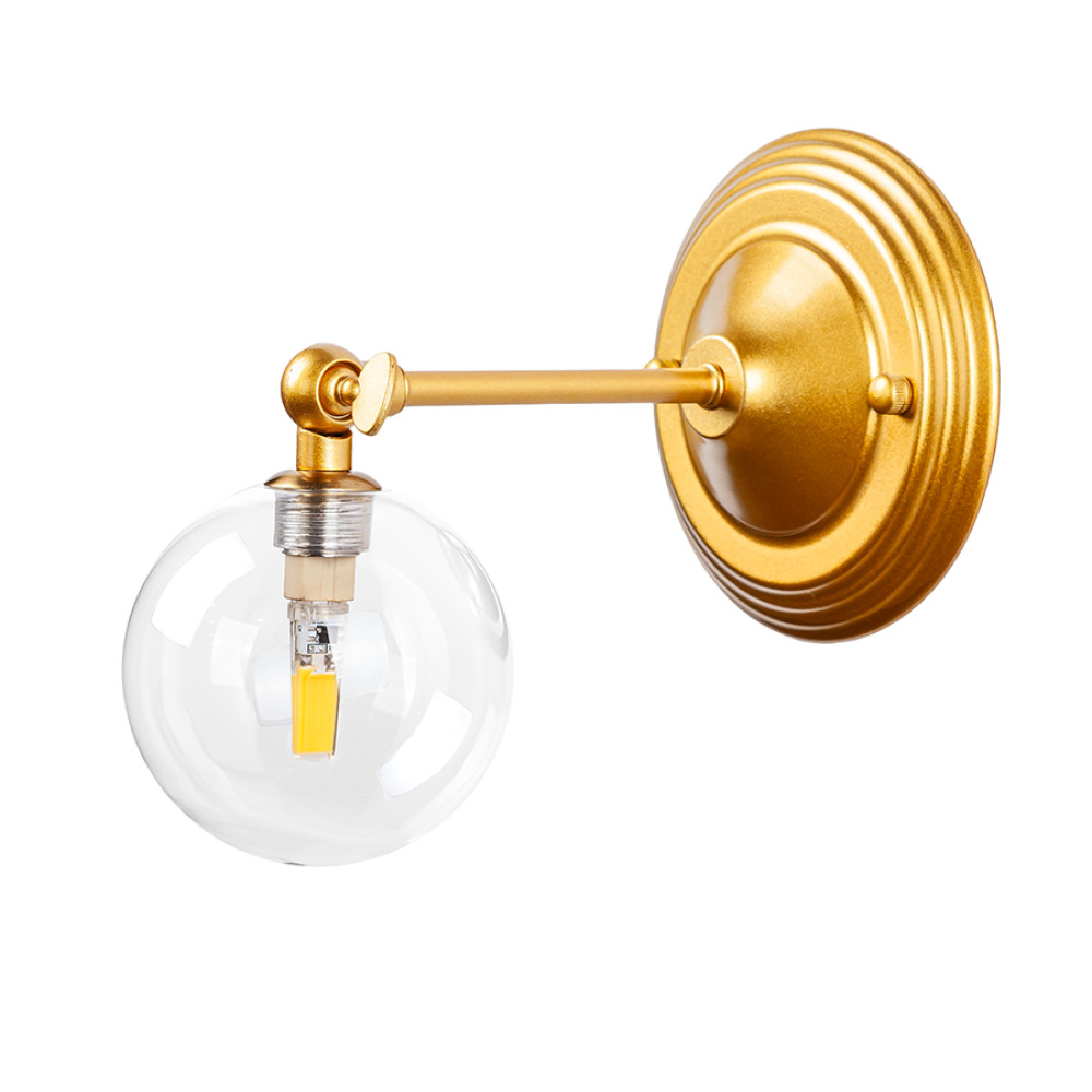 Стильний настінний світильник Бра-молекула на одну лампу зі скляним плафоном у вигляді кулі.Плафон оснащений поворотним механізмом. Компактний розмір та мінімалістичний дизайн роблять цю модель універсальним варіантом для кімнат, коридорів чи робочих зон.