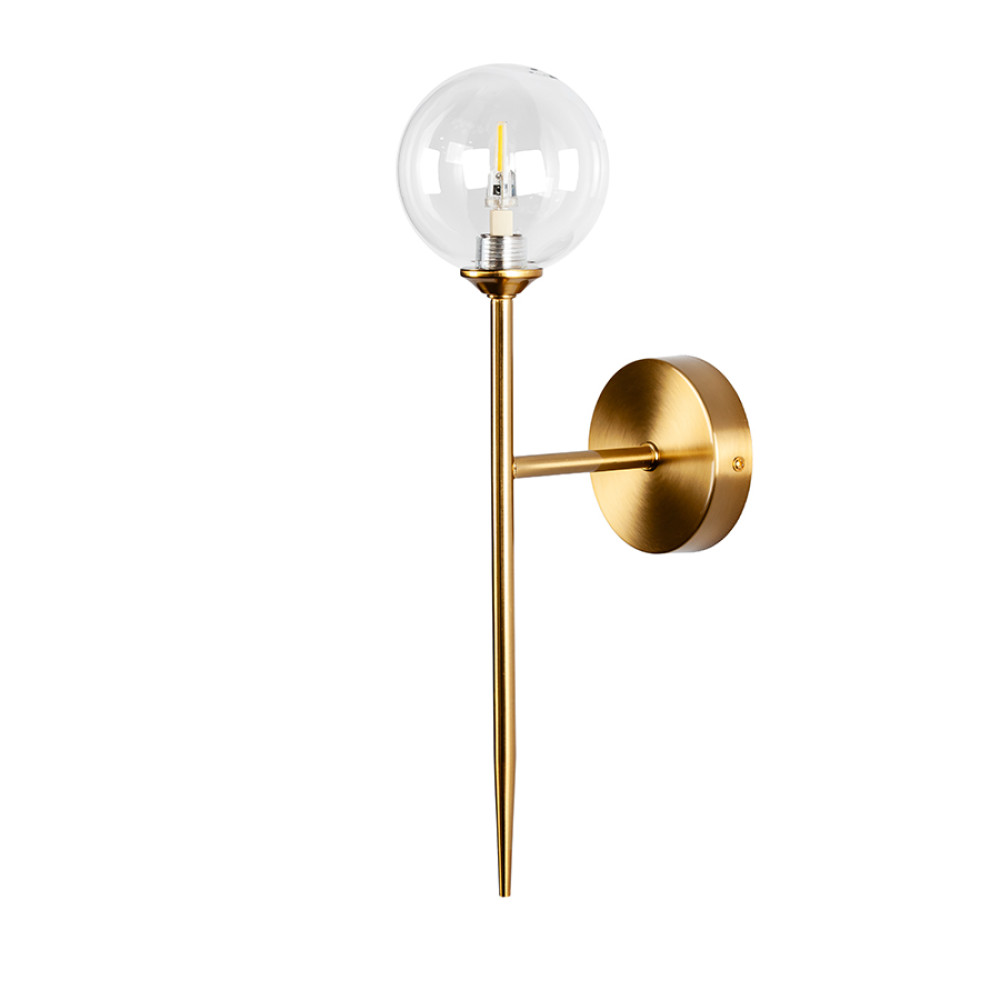 Стильний настінний світильник Бра-молекула на одну лампу зі скляним плафоном у вигляді кулі на довгій металевій трубці.Лаконічний і мінімалістичний дизайн роблять цю модель універсальним варіантом для кімнат, коридорів або робочих зон.