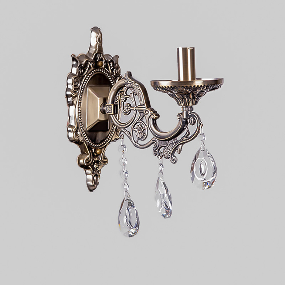 Настінний світильник Бра на одну лампу в класичному стилі у вигляді свічника з кришталевими підвісками.