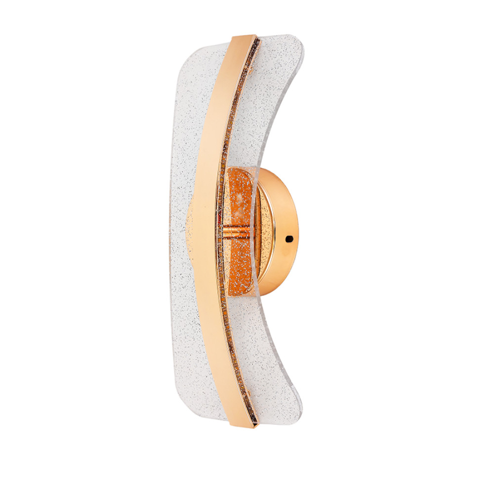 Стильний сучасний настінний LED світильник Бра на одне джерело світла з функцією регулювання колірної температури. Світильник має нестандартну форму з елегантним дизайном який представлений у вигляді плоского акрилового плафона дугоподібної форми прикрашеного дрібними блискітками: що створює приємний візуальний ефект при включеному джерелі світла.