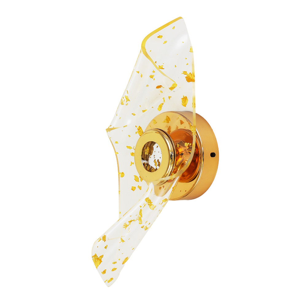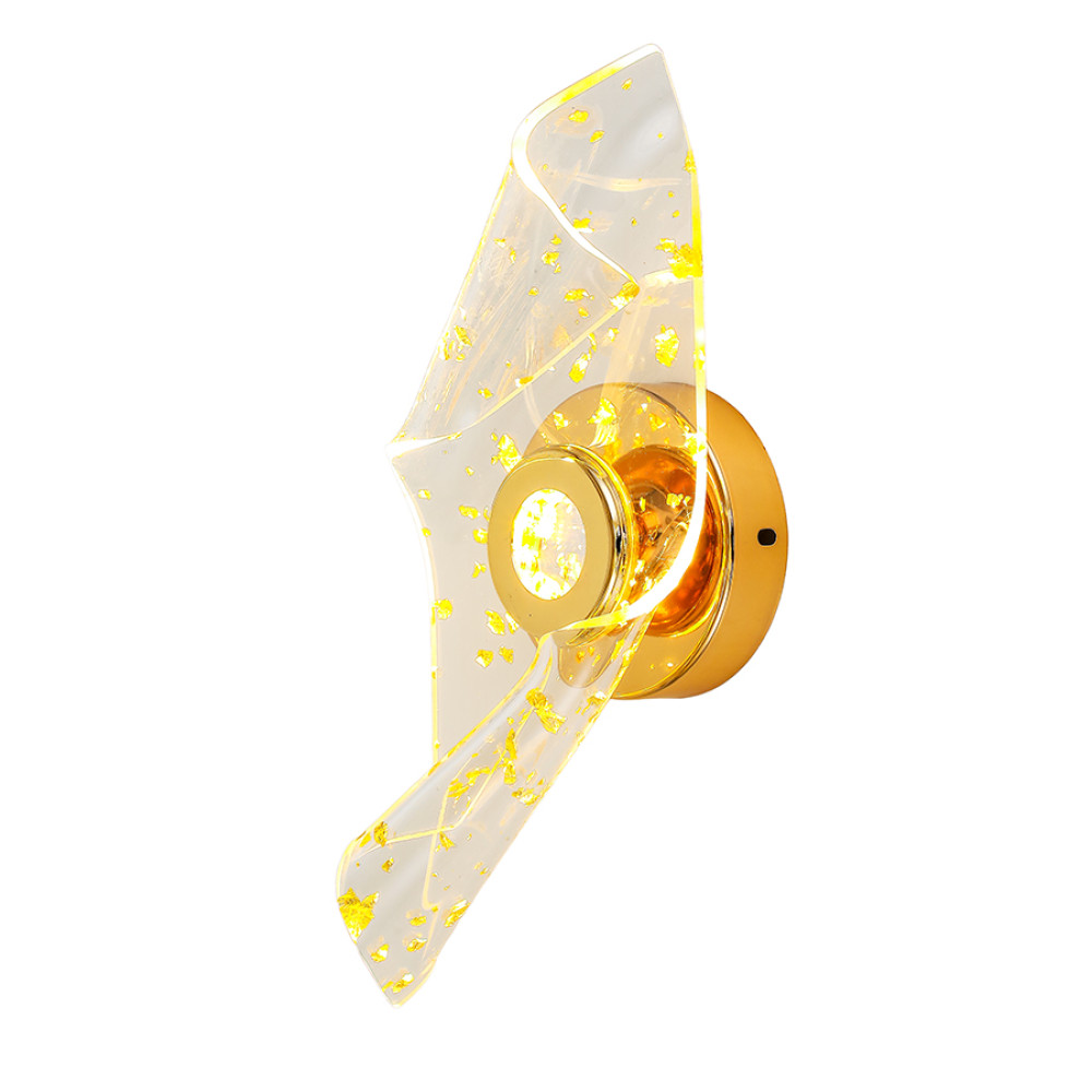 Стильний сучасний настінний LED світильник Бра на одне джерело світла з функцією регулювання колірної температури. Світильник має нестандартну форму з елегантним дизайном який представлений у вигляді акрилового плафона витягнутої форми хаотично прикрашеного золотими цятками: що створює приємний візуальний ефект при включеному джерелі світла.