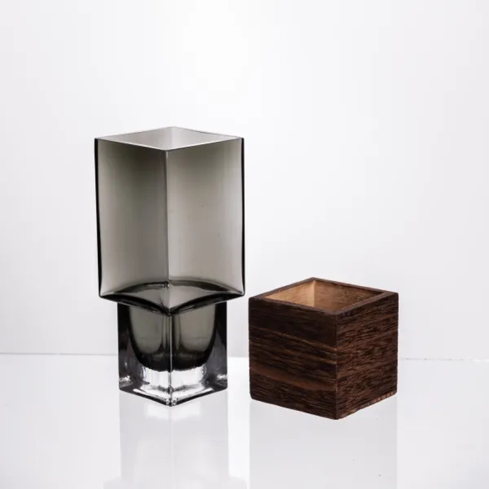 Ефектна ваза, що поєднує прозорість скла та теплу фактуру натурального дерева. Суворі геометричні форми та мінімалістичний дизайн роблять її універсальним елементом декору: підійде як для сучасних інтер'єрів у стилі мінімал та скандинавського затишку, так і для контрастних акцентів у класичних приміщеннях.
