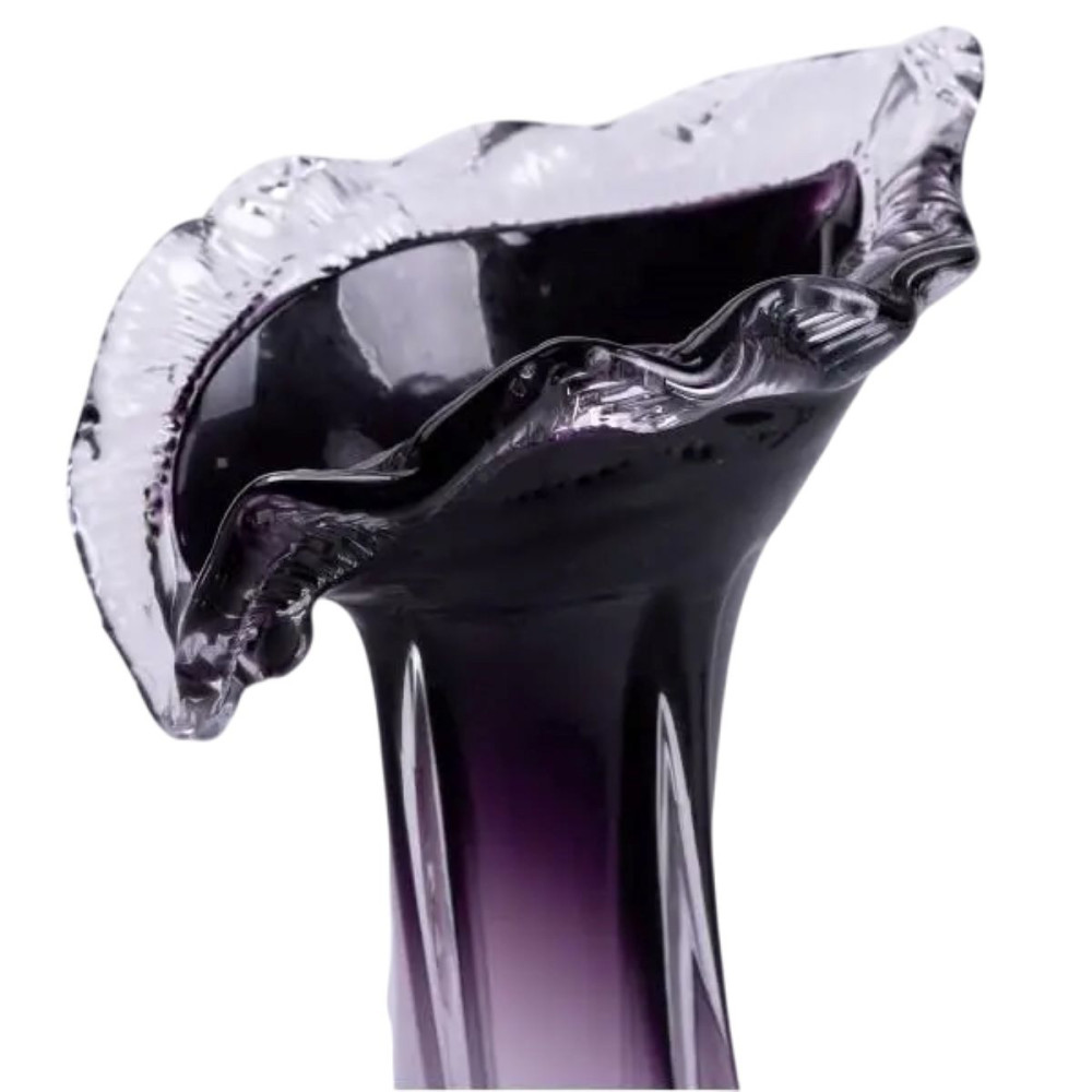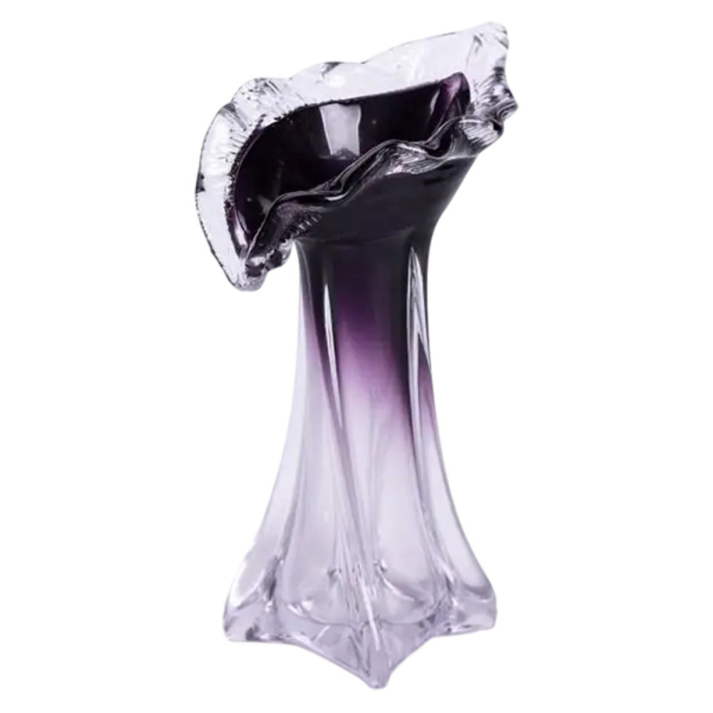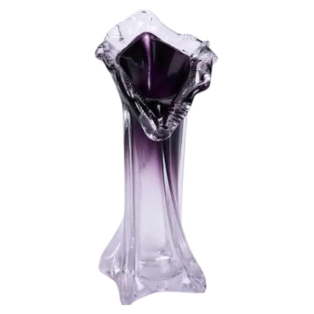 Скляна ваза ручної роботи, має незвичайний дизайн, фігурну форму з декоративним розширенням у верхній частині та плавний перехід від прозорого до фіолетового кольору.