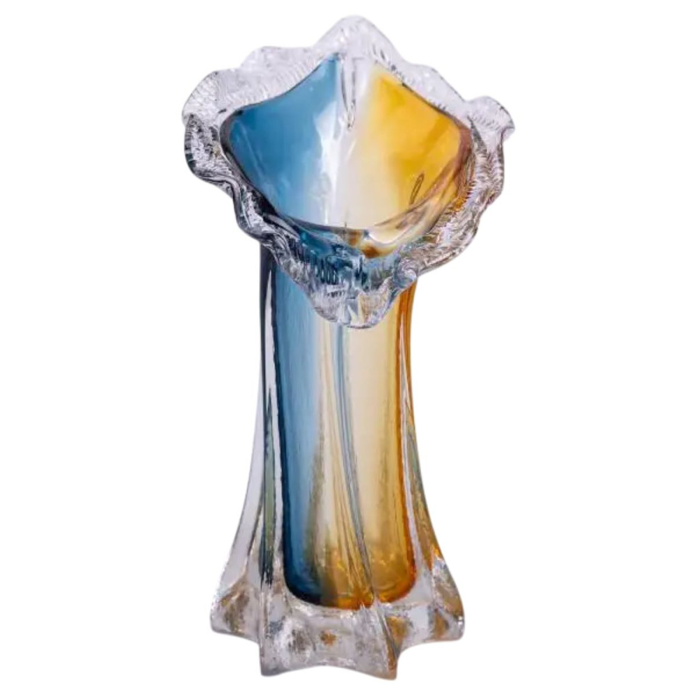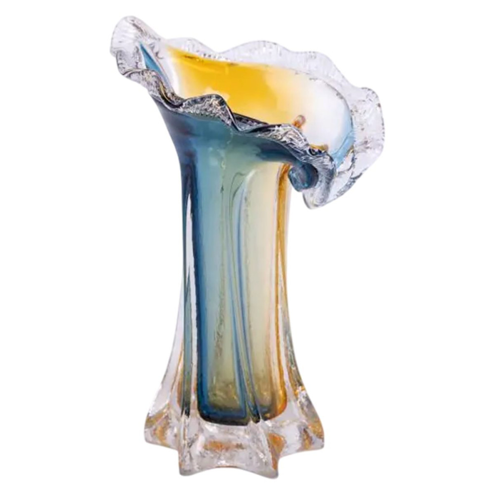 Скляна ваза для квітів, ручної роботи, має незвичайний дизайн, фігурну форму з декоративним розширенням у верхній частині та плавний перехід від жовтого до синього кольору.