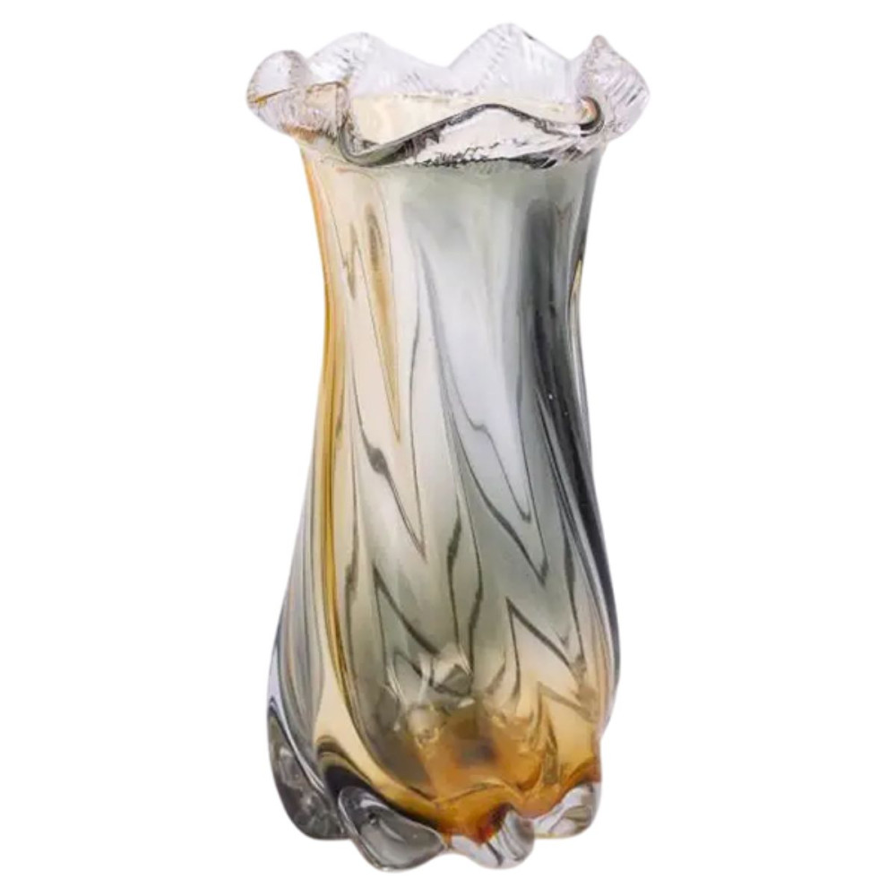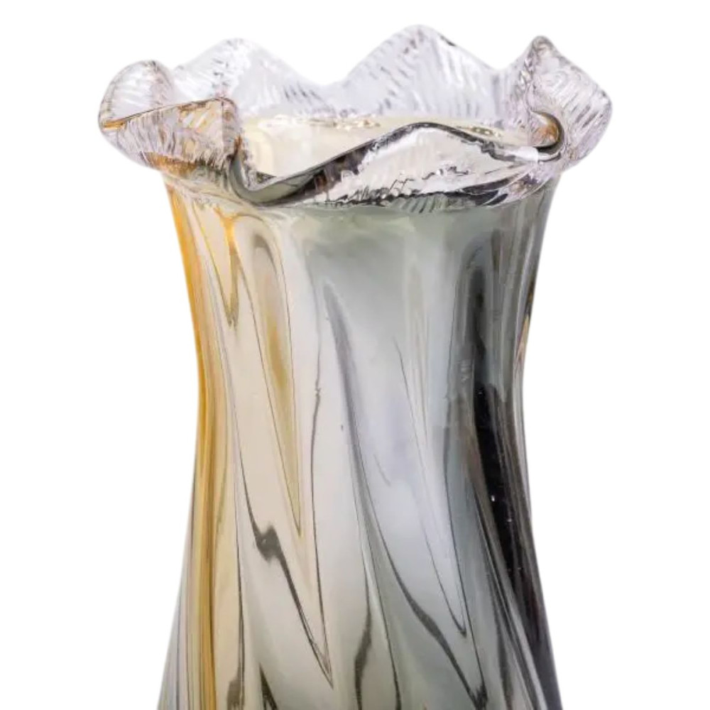 Скляна ваза для квітів, ручної роботи, має незвичайний дизайн, фігурну форму з декоративним розширенням у верхній частині та плавний перехід від жовтого до сірого кольору.