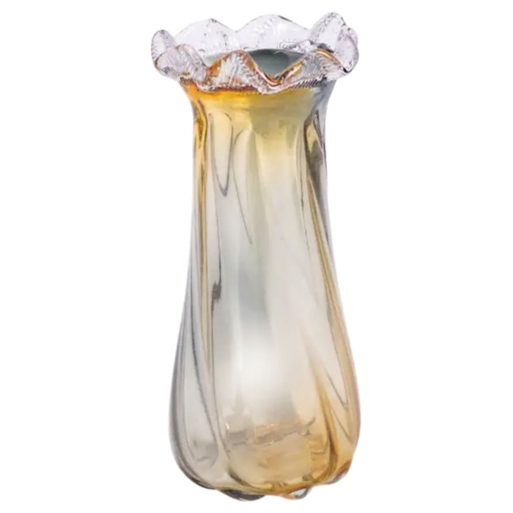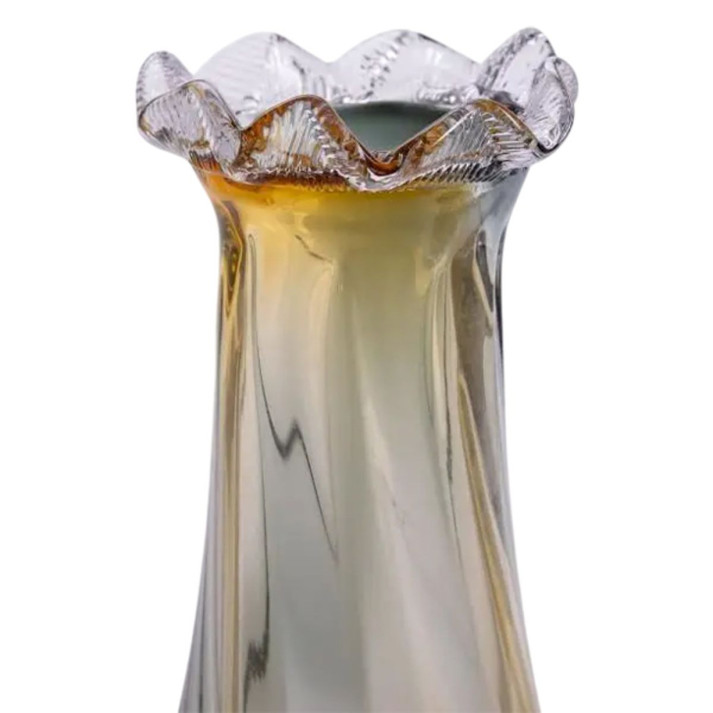Скляна ваза для квітів, ручної роботи, має незвичайний дизайн, фігурну форму з декоративним розширенням у верхній частині та плавний перехід від жовтого до сірого кольору.