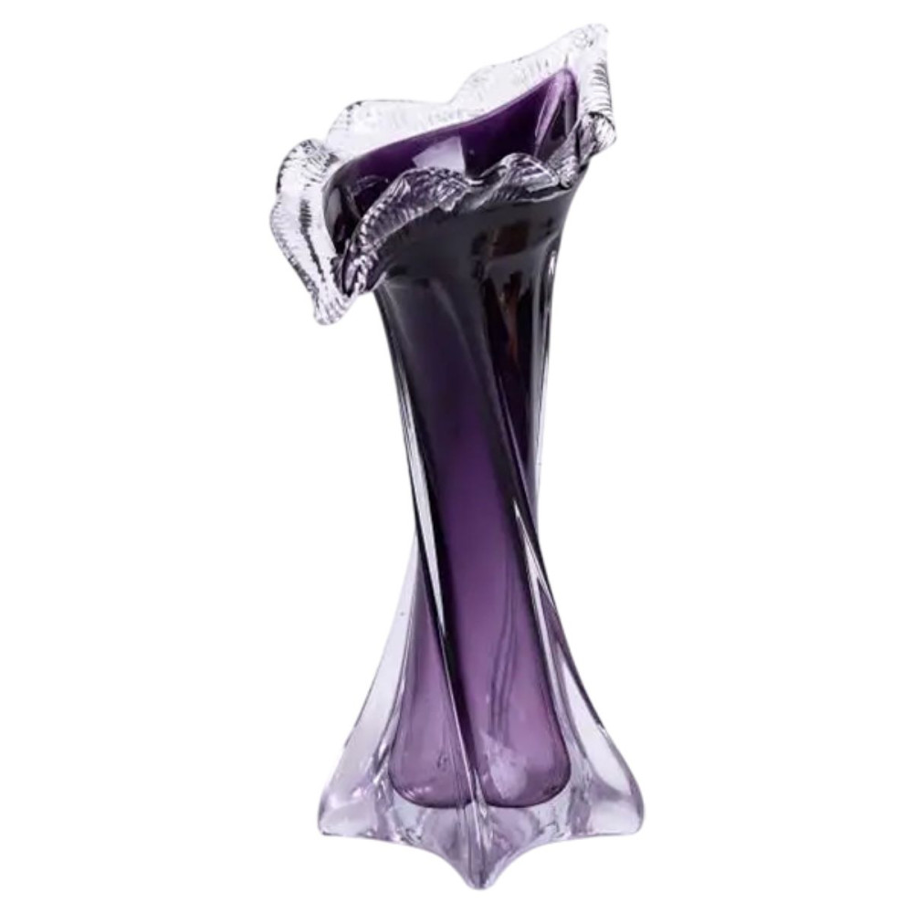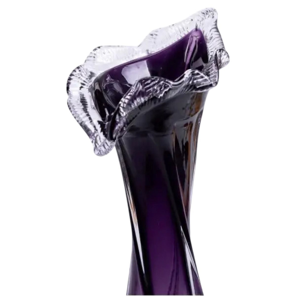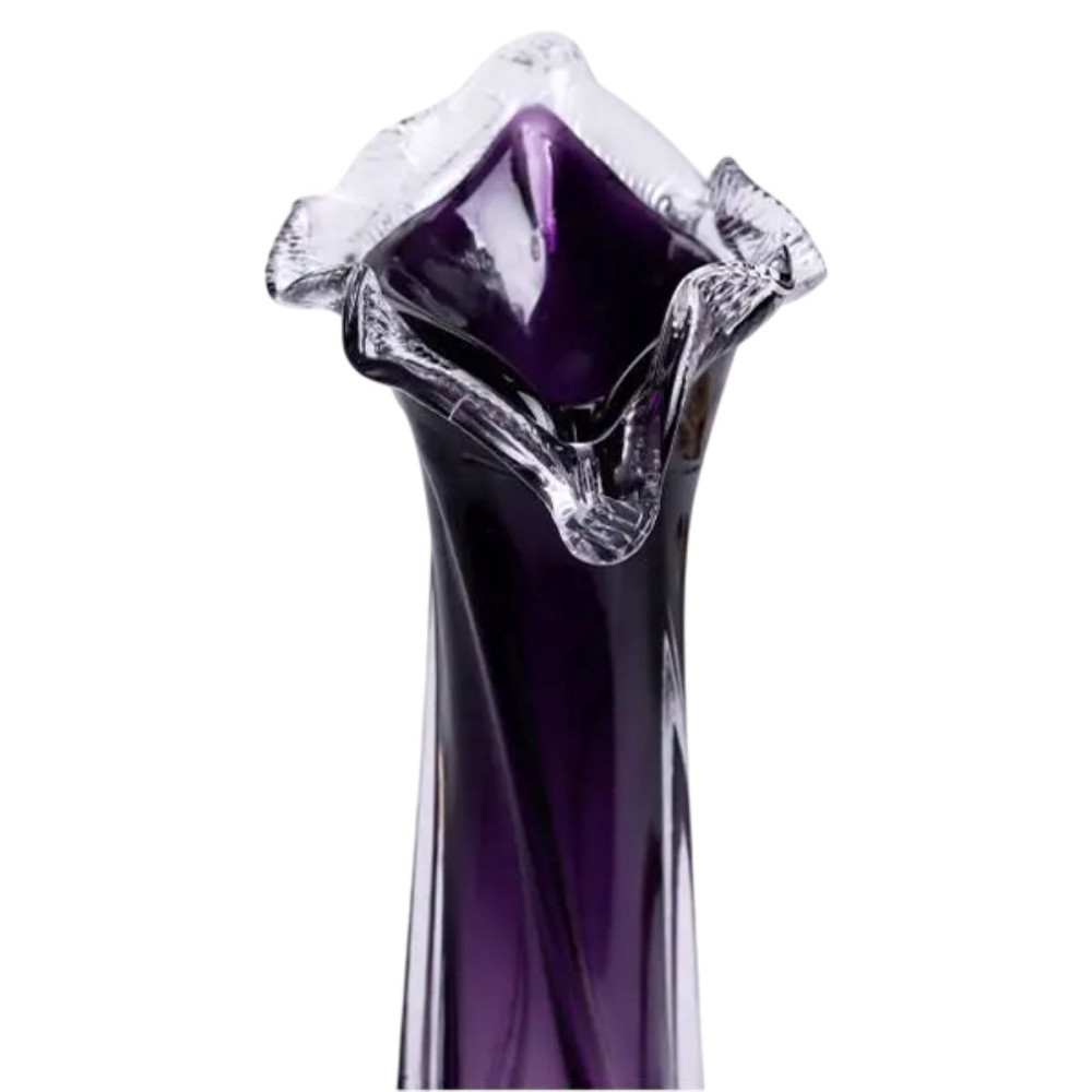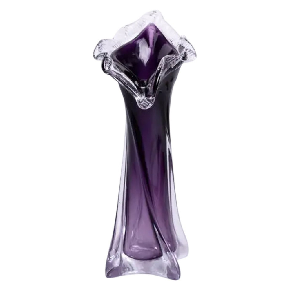 Скляна ваза ручної роботи, має незвичайний дизайн, фігурну форму з декоративним розширенням у верхній частині та плавний перехід від прозорого до фіолетового кольору.