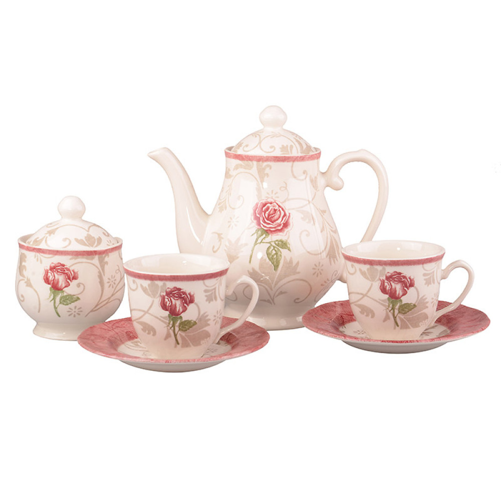 Чайний сервіз Lefard "Дамаск фловер пінк" на 6 персон із чайником 910-084 рожевий - це вишуканий керамічний набір на 6 персон у ніжному білому кольорі.