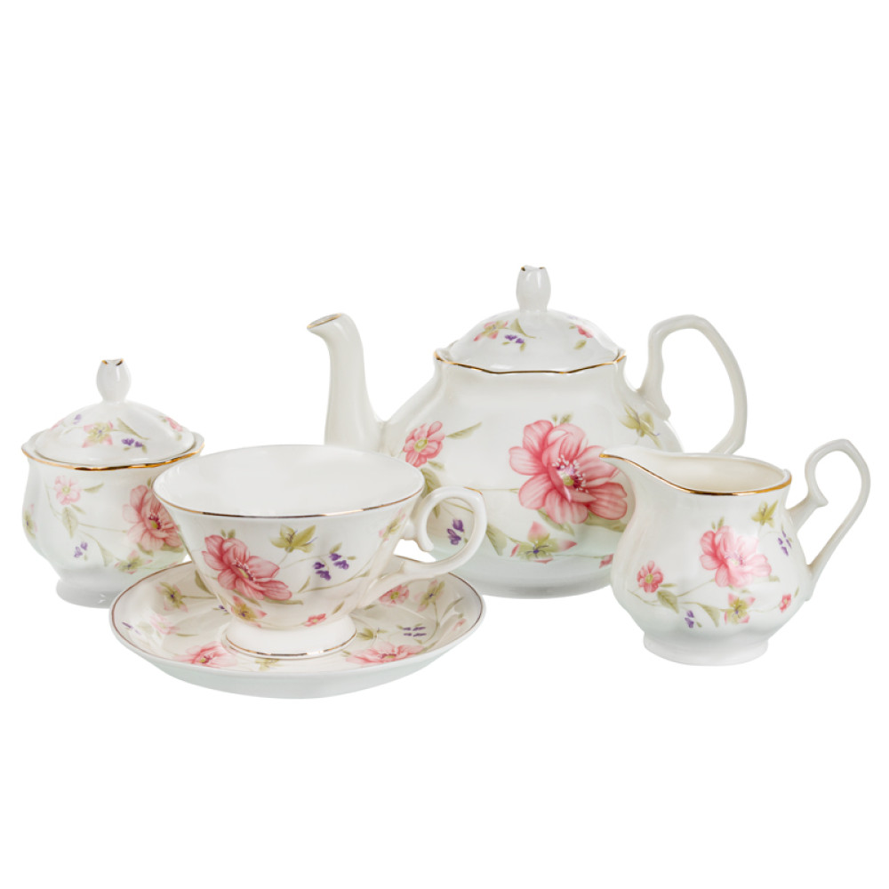 Комплектація: 6 чашок із блюдцями, чайник, цукорниця, молочниця, подарункова упаковка