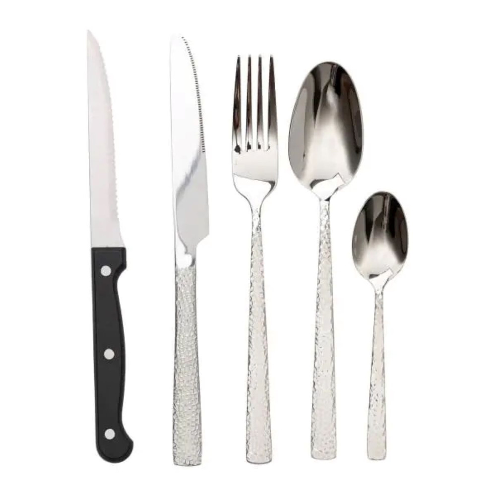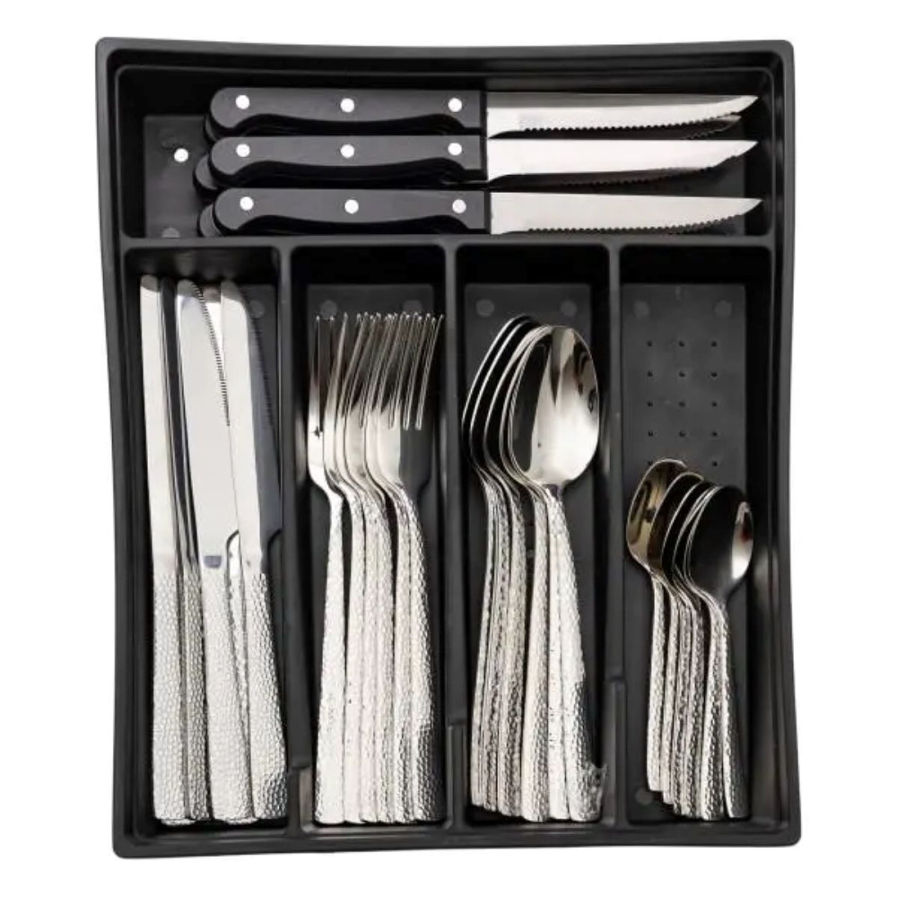 Набор столовых приборов в футляре рассчитан на 6 персон и содержит 30 предметов: 6 столовых ложек, 6 чайных ложек, 6 вилок, 6 столовых ножей и 6 ножей для стейков. Комплект обеспечивает полный набор необходимых приборов для сервировки стола, включая специальные ножи для удобной нарезки мяса. Благодаря удобному футляру все предметы хранятся в одном месте, что помогает поддерживать порядок и защищает их от повреждений. Основные характеристики: Количество предметов в наборе: 30 шт.; Количество персон: 6; Материал: нержавеющая сталь, кухонный нож (ручка) - пластик; Упаковка: коробка; Размеры приборов: длина столового ножа: 23 см; длина кухонного ножа: 23 см; длина столовой ложки: 20.5 см; длина столовой вилки: 21 см; длина чайной ложки: 14 см. Комплектация набора: столовый нож: 6 шт.; кухонный нож: 6 шт.; столовая ложка: 6 шт.; столовая вилка: 6 шт.; чайная ложка: 6 шт.. Приборы изготовлены из нержавеющей стали, что обеспечивает прочность, устойчивость к коррозии и долговечность. Полированная поверхность придает им привлекательный вид и облегчает очистку. Эргономичная форма обеспечивает удобный хват, а ножи для стейков имеют заостренные лезвия для легкого разрезания мясных блюд. Комплект идеально подходит как для ежедневного использования, так и для особых случаев. Футляр делает его удобным для хранения и транспортировки, что может быть полезным для выездов или подарочных наборов. Все предметы легко моются вручную или в посудомоечной машине, сохраняя свой вид и функциональность.