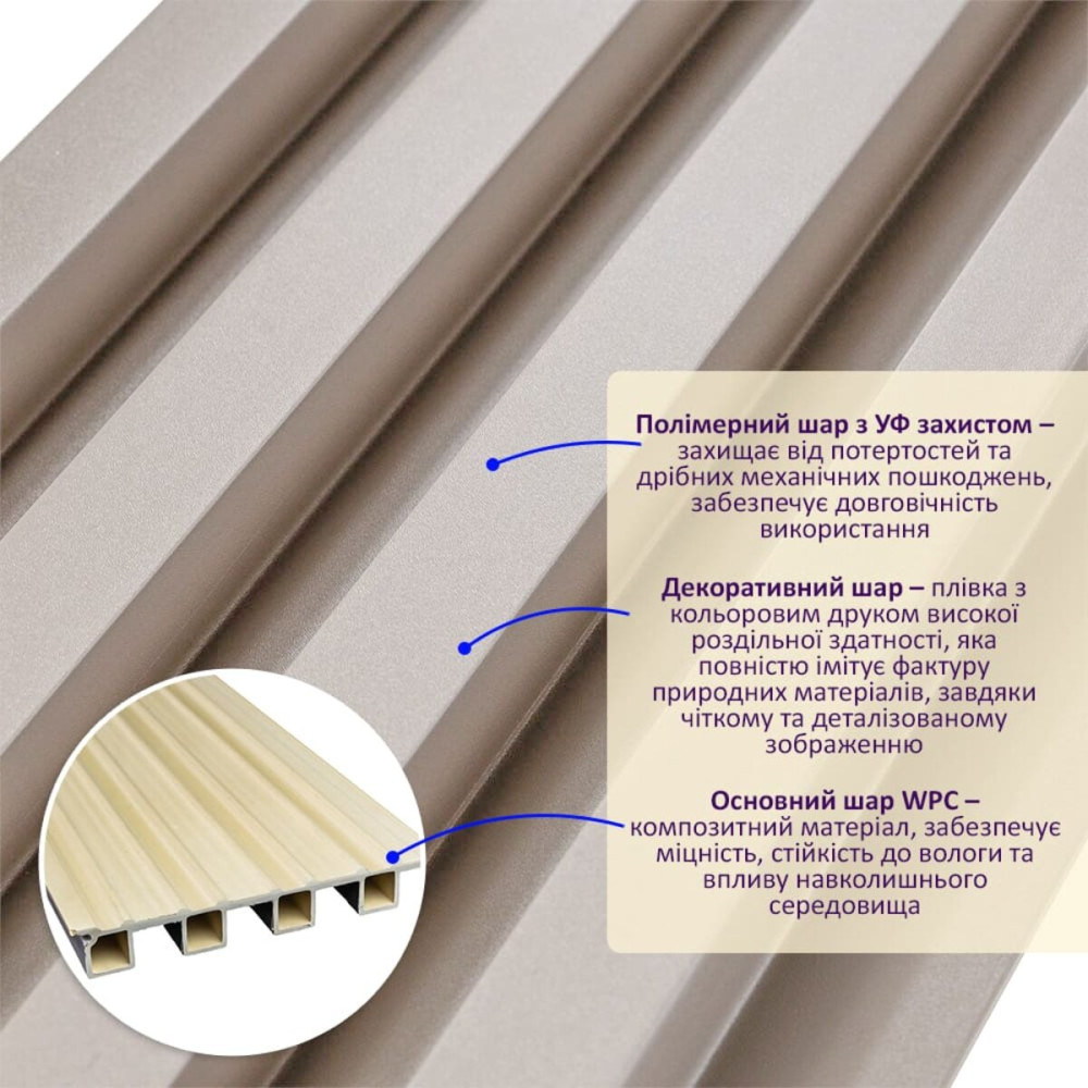 • Полимерный слой, защищает от потертостей и мелких механических повреждений, обеспечивает долговечность использования, а УФ защита помогает предотвратить выгорание, сохраняя цвет декоративного слоя насыщенным, за счет чего рейка долго имеет свой первоначальный эстетический вид.