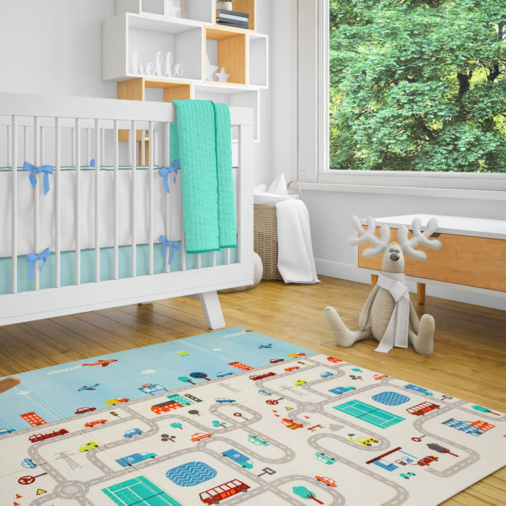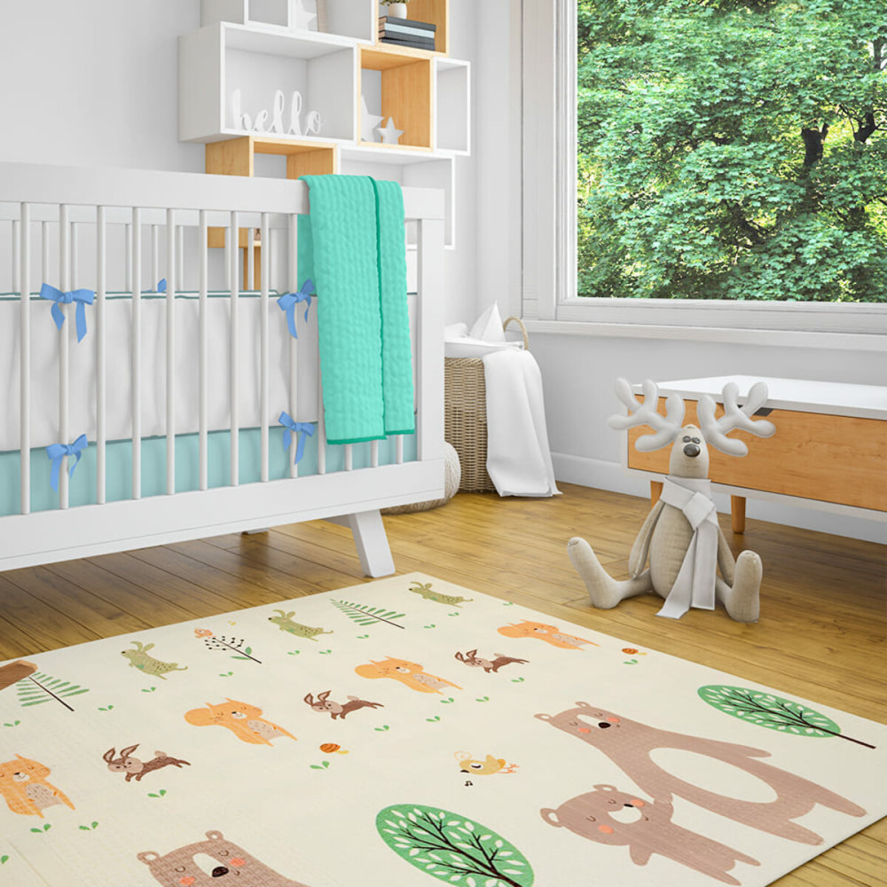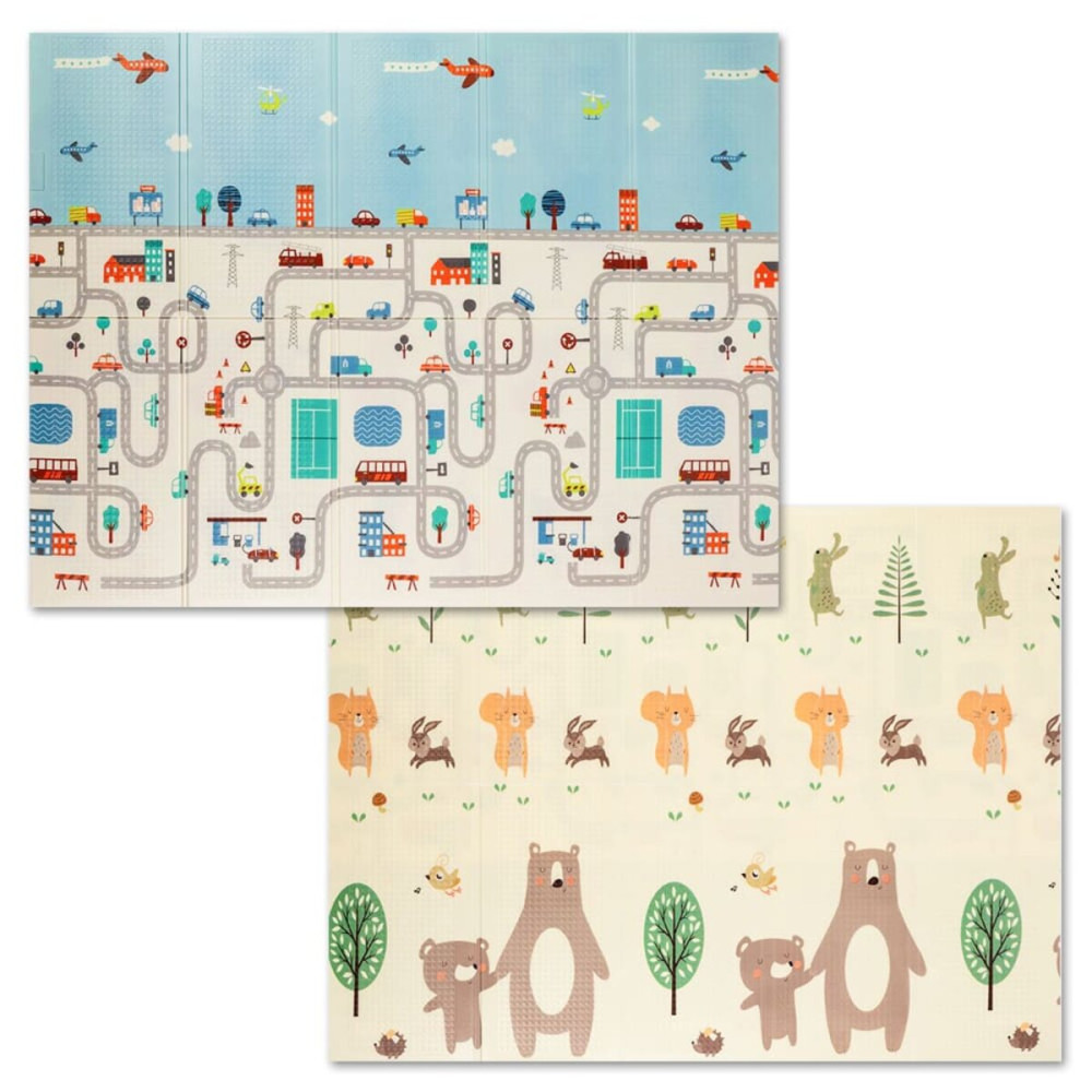 - Двусторонность ковриков с разными принтами: яркие цвета и насыщенные рисунки на одной стороне могут привлекать внимание и стимулировать познавательные процессы, сенсорное развитие малыша, а более сдержанные оттенки второй стороны служат для спокойного отдыха и релаксации ребенка.
