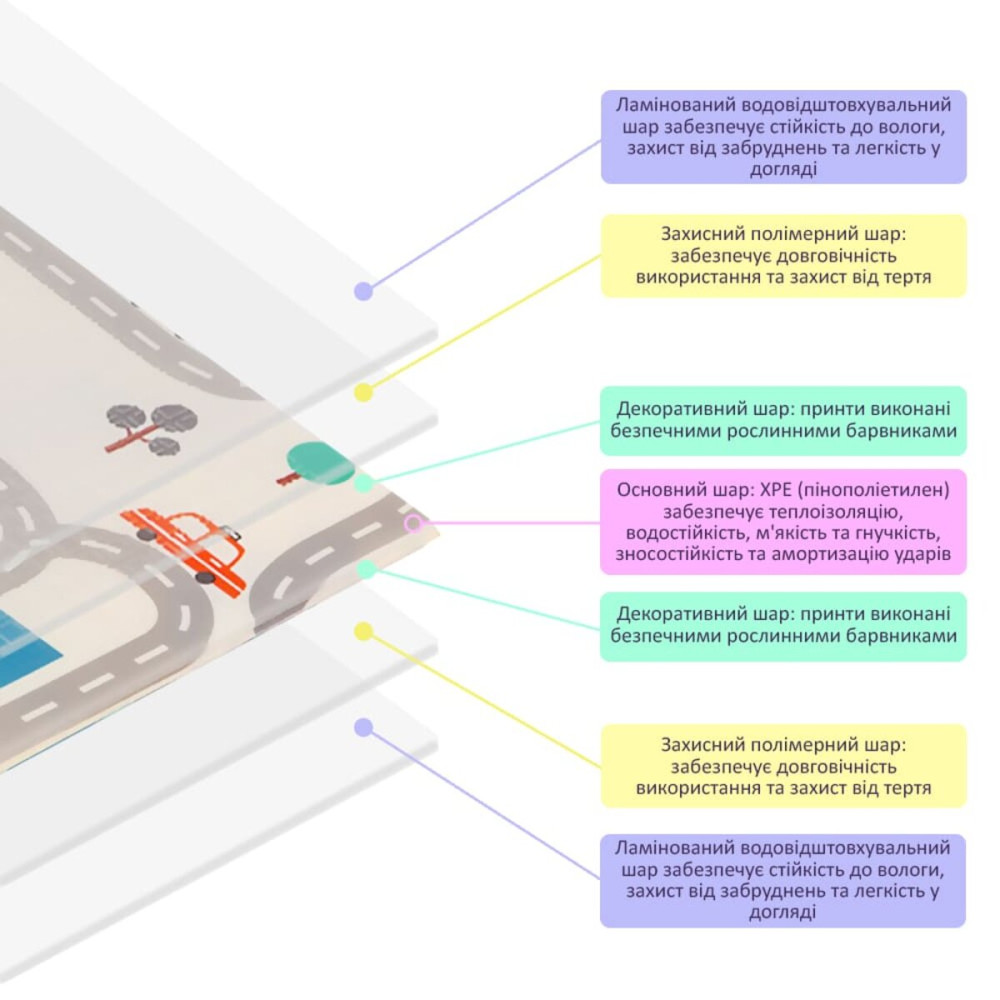 Детские развивающие термоковрики изготавливаются из мультифункционального, нетоксичного и гипоаллергенного материала XPE (вспененный и прессованный полимер этилена), объединяет в себе множество преимуществ: теплоизоляция, влагостойкость, износоустойчивость, простота в уходе, мягкость, гибкость и амортизация падения малыша, обеспечивая детям комфортную и безопасную игровую поверхность.