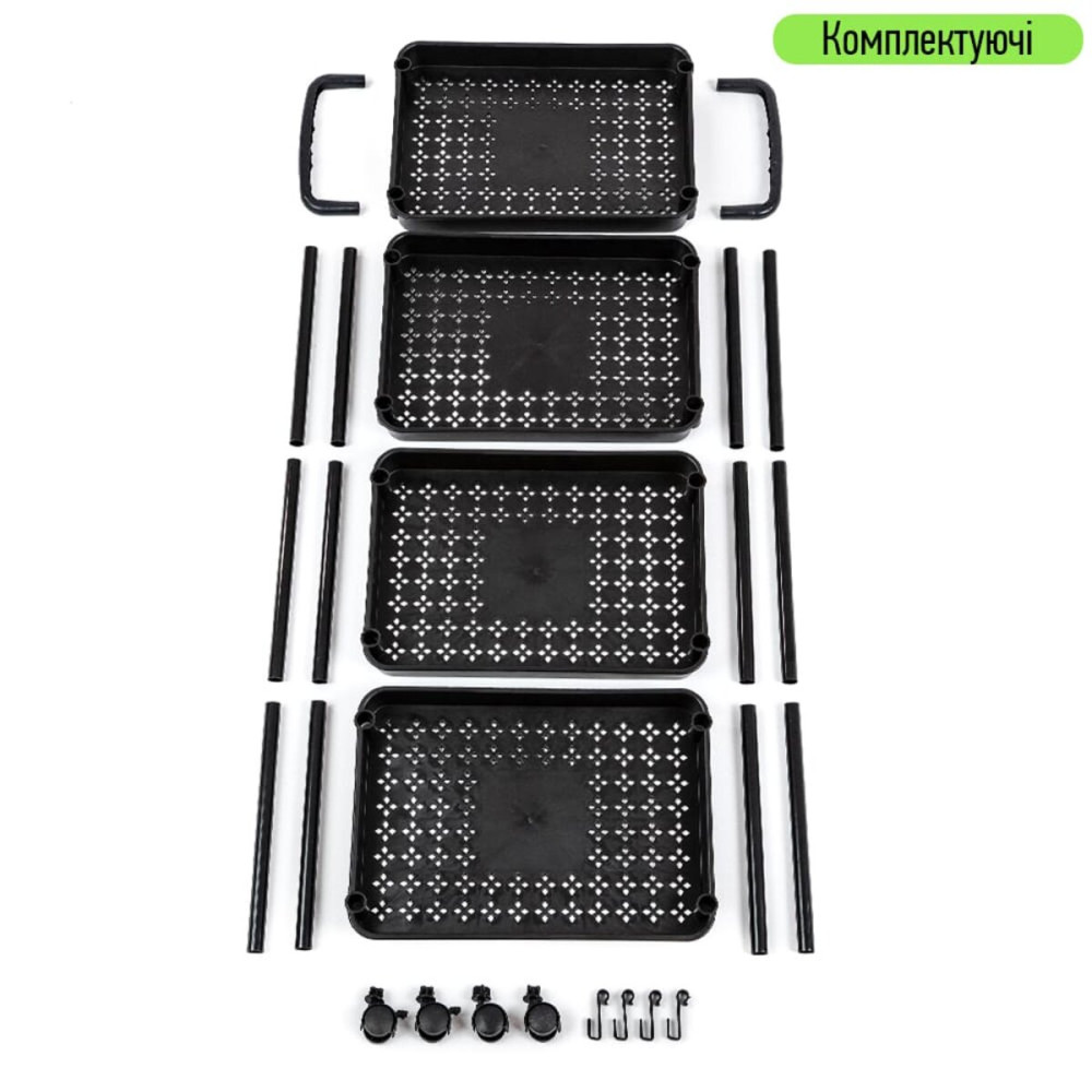Сборная конструкция изготовлена из высококачественного пластика, что обеспечивает легкость и удобство в использовании. Пластик обладает устойчивостью к механическим повреждениям и ультрафиолетовому излучению, что позволяет использовать этажерки как в помещениях, так и на открытом воздухе, не опасаясь за их долговечность.
