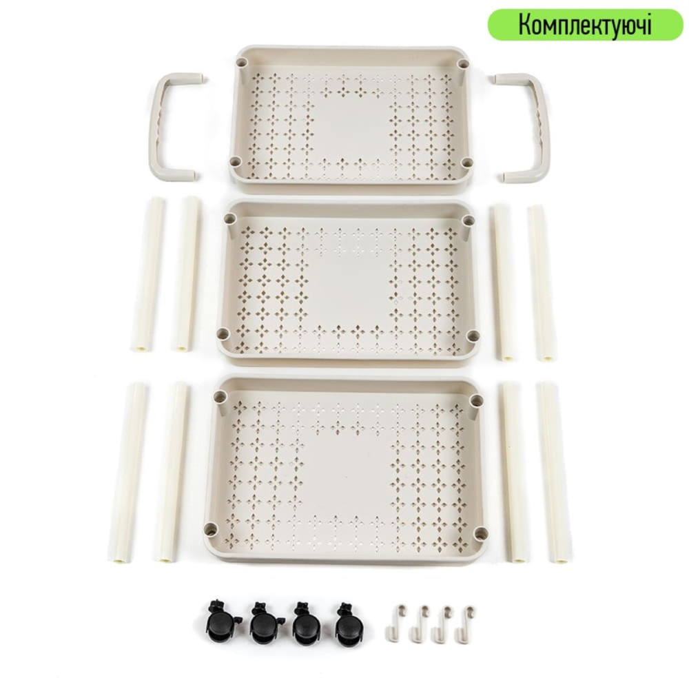 Сборная конструкция изготовлена из высококачественного пластика, что обеспечивает легкость и удобство в использовании. Пластик обладает устойчивостью к механическим повреждениям и ультрафиолетовому излучению, что позволяет использовать этажерки как в помещениях, так и на открытом воздухе, не опасаясь за их долговечность.