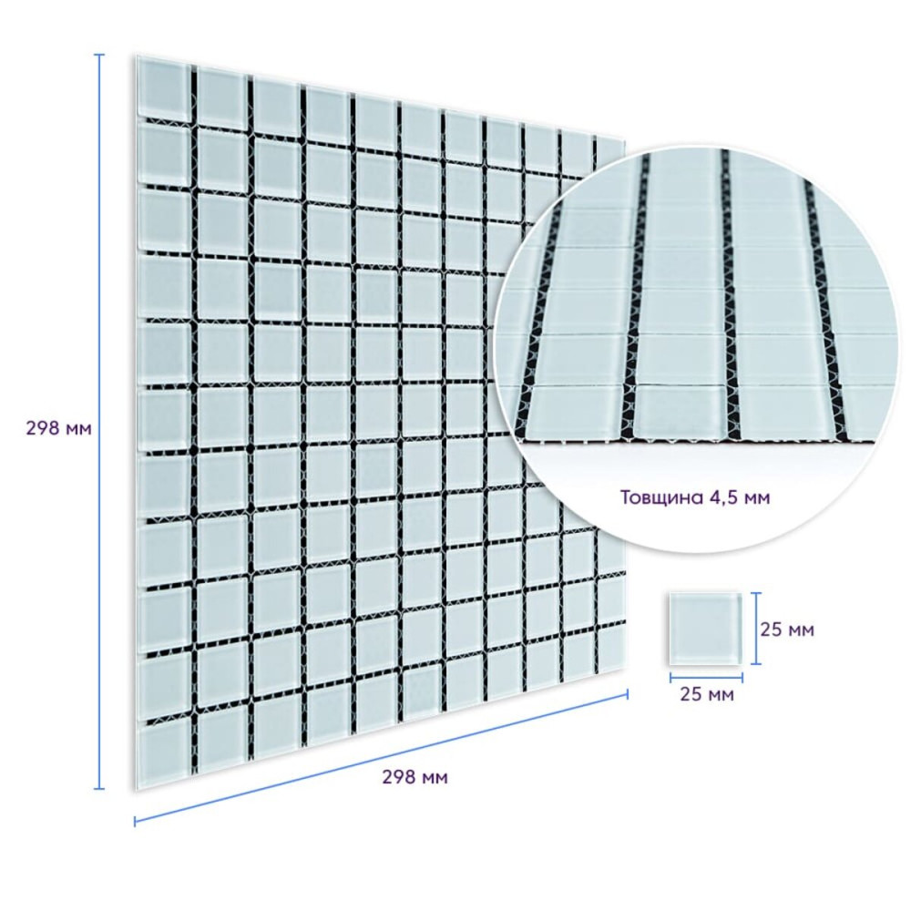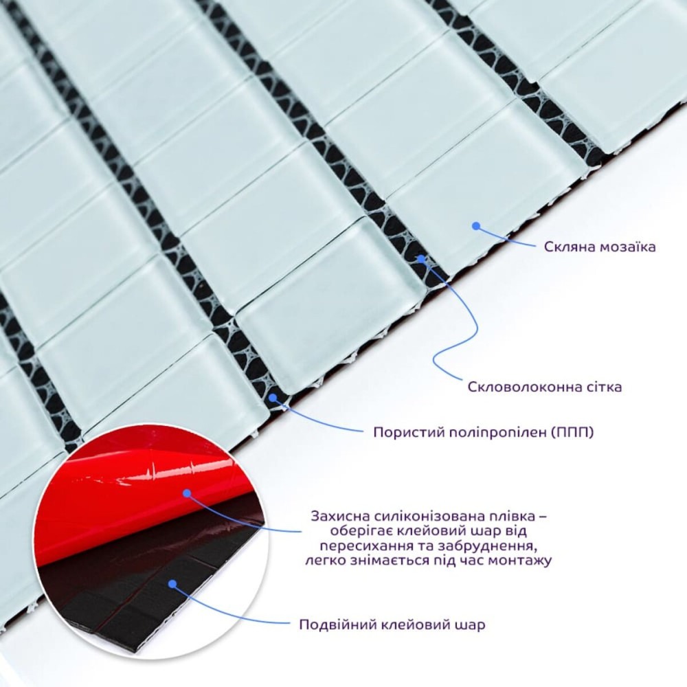 Стеклянная мозаика – маленькая квадратная долька (тессер), изготовленная из прочного, прозрачного стекла. Сеть. Каждый кусочек мозаики, прикрепленный к основанию из полимерной или стекловолоконной сетки, позволяет легко монтировать всю плитку как целостное покрытие.Пористый полипропилен (ППП) – это термопластичный полимер, его структура включает повторяющиеся молекулярные единицы пропилена. Он имеет ячеистую структуру, благодаря чему имеет хорошую термоизоляцию и низкую плотность, а соответственно и малый вес. Пористый полипропилен также устойчив к влаге и химически инертен.Двойной клеевой слой: нетоксичное основание с высоким уровнем адгезии.Защитная силиконовая пленка – предохраняет клеевой слой от пересыхания и загрязнения, легко снимается при монтаже.Основные преимущества стеклянной мозаики: