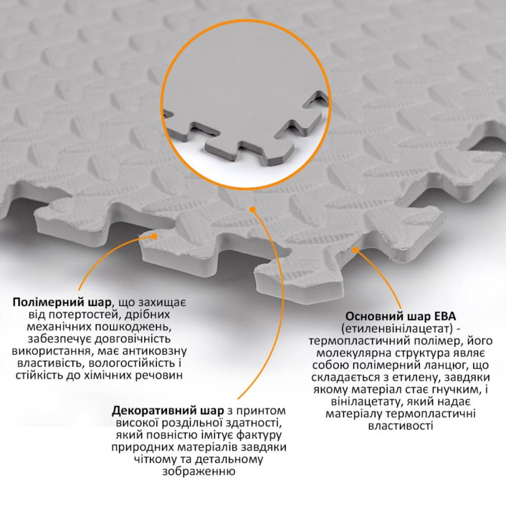 Напольное модульное покрытие «Пазлы» представляет собой модульные плиты с вырезанными замками соединениями, которые легко стыкуются между собой, образуя устойчивое и прочное покрытие. Ключевые характеристики напольного покрытия: мягкость и амортизация (благодаря основному материалу ЕВА), химо- и водостойкость, износостойкость, теплоизоляция и малый вес.Замки снимаются.