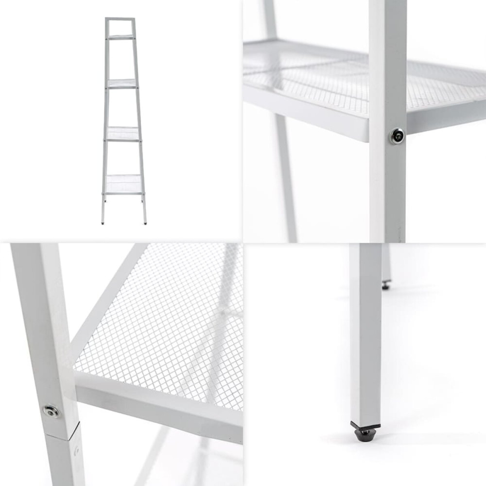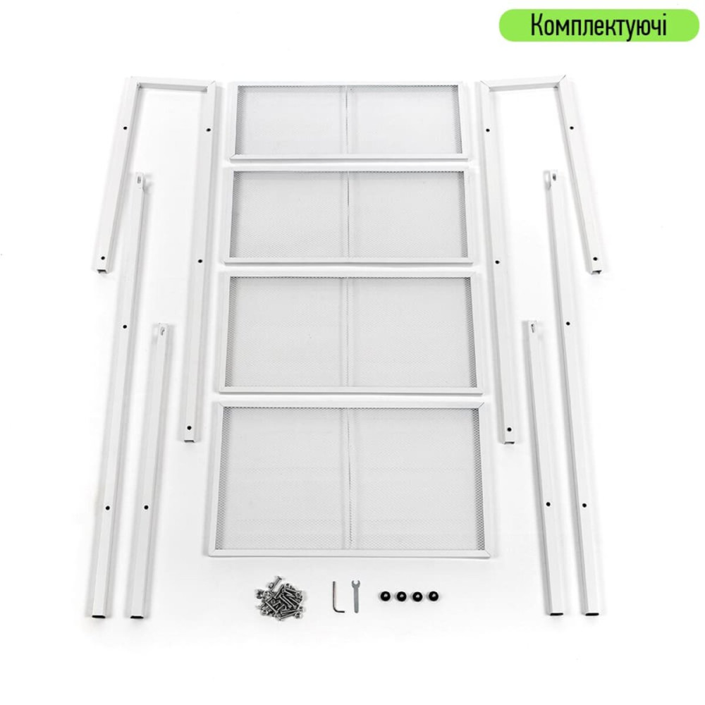 Каждый стеллаж представляет собой прочную металлическую конструкции, выполненную из сборного стального профиля и сетчатых полок. Стеллажи окрашены белой глянцевой эмалью для защиты от коррозии и долговечности.