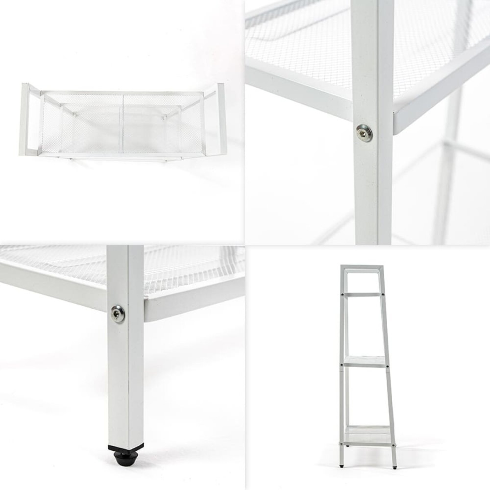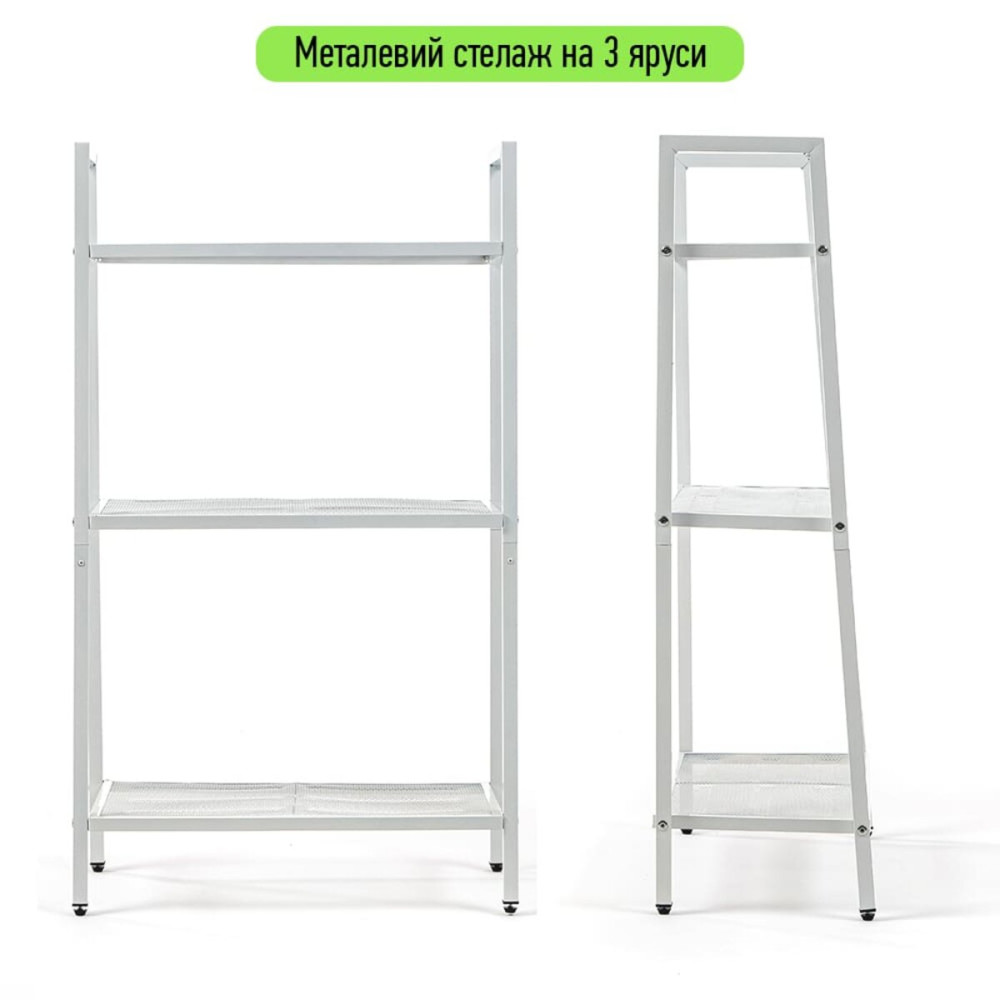 Каждый стеллаж представляет собой прочную металлическую конструкции, выполненную из сборного стального профиля и сетчатых полок. Стеллажи окрашены белой глянцевой эмалью для защиты от коррозии и долговечности.