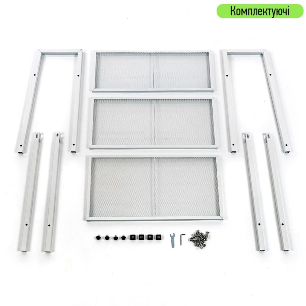 3 полки разной ширины – по 1 шт каждого размера; пластиковые заглушки с резьбой – 4 шт; пластиковые ножки (круглые) – 4шт; метизы - 12 комплектов (болт и гайка); шестигранник для болтов – 1 шт; ключ рожковый – 1 шт; U-образные или Г-образные профили – 2 шт; Прямые вставные профили; Материалы:
